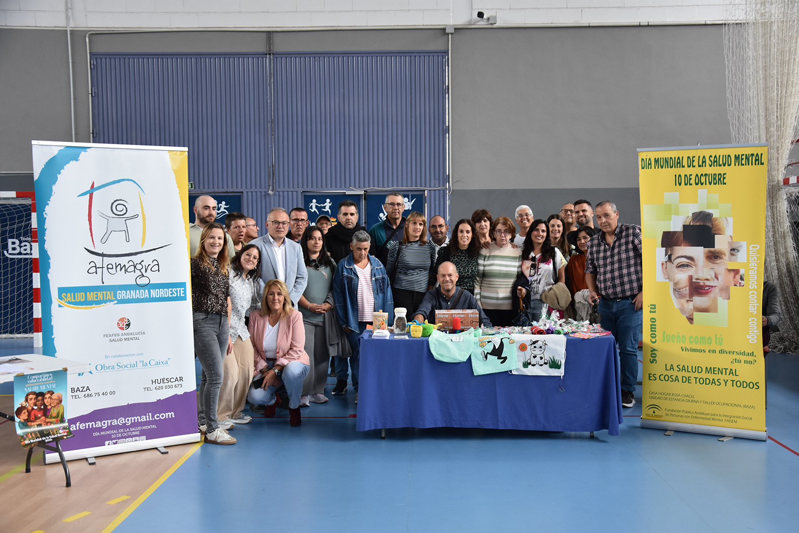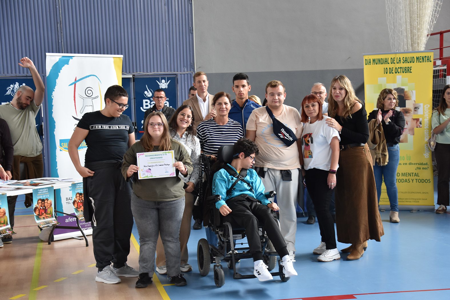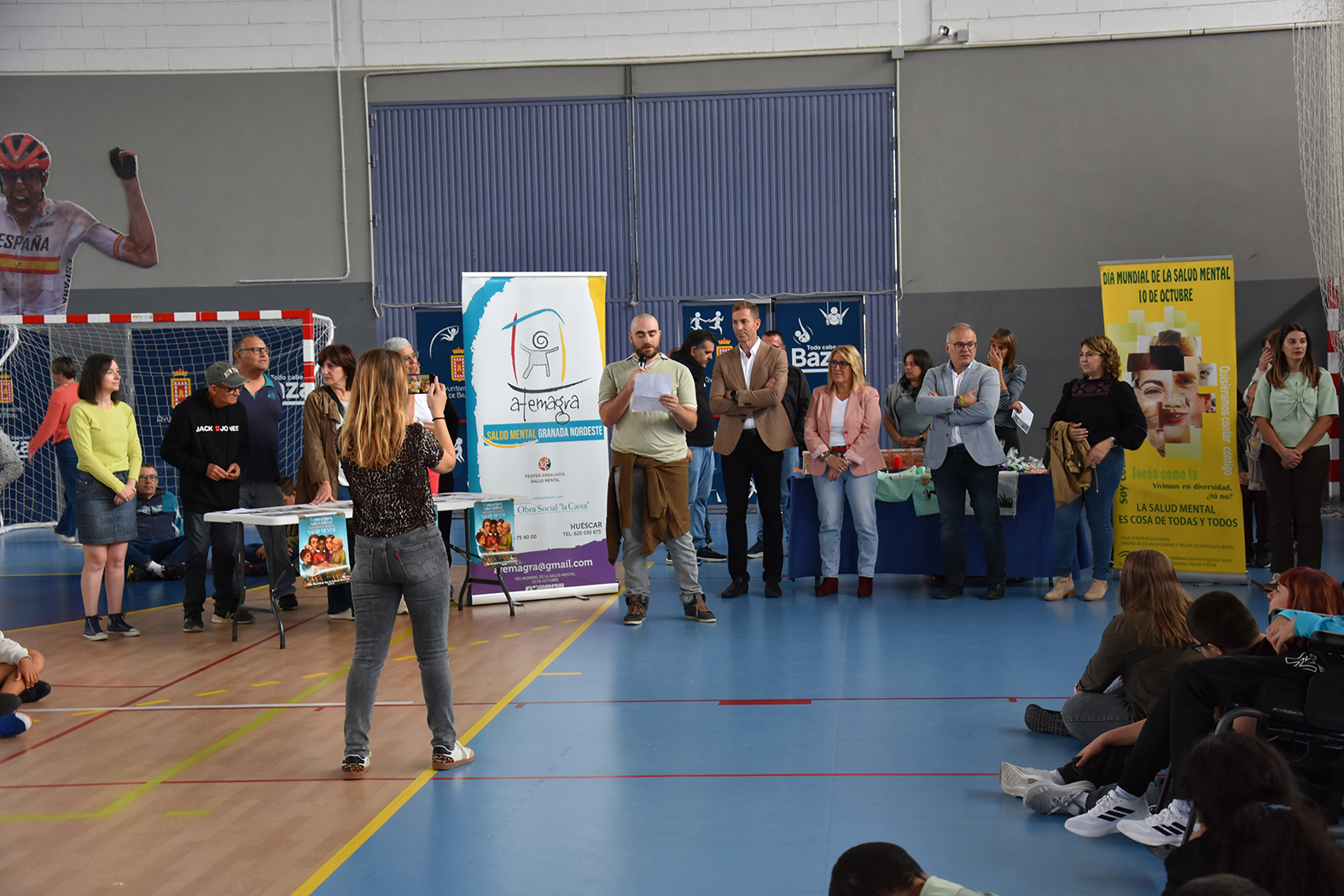 Acompañados por varias decenas de jóvenes, Afemagra y Faisem, entidades que trabajan en nuestra ciudad con personas con problemas de salud mental, han protagonizado en la mañana del 10 de octubre los actos de celebración del Día Mundial de la Salud Mental en Baza. La cita, prevista en principio en la Plaza Mayor, se desplazó hasta el pabellón municipal de deportes para evitar las previsiones de lluvia. Entre los numerosos asistentes se contó con la presencia de los alumnos de distintas aulas específicas de los centros de secundaria del municipio e incluso un stand informativo del proyecto Eracis+. También acudieron a la llamada el alcalde de Baza, Pedro J. Ramos, la concejala de Salud, Mª Carmen Sánchez, y el concejal que se ha hecho cargo de la concejalía de Bienestar Social durante la baja por embarazo de Priscila Martínez, Ramón López.