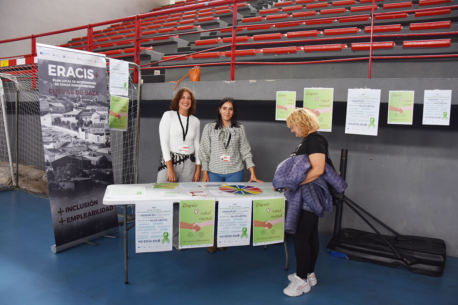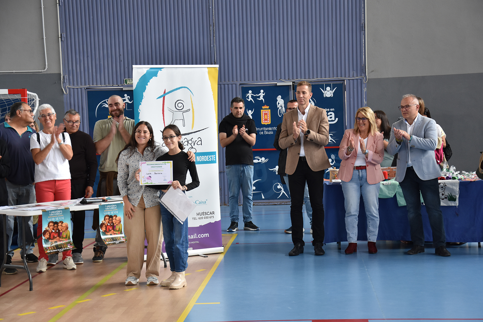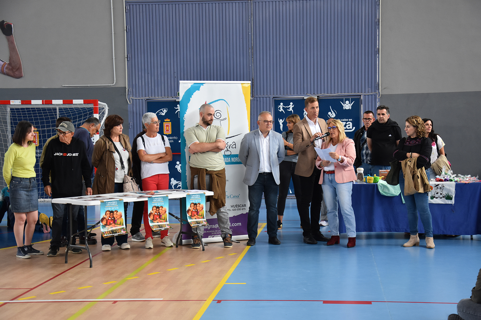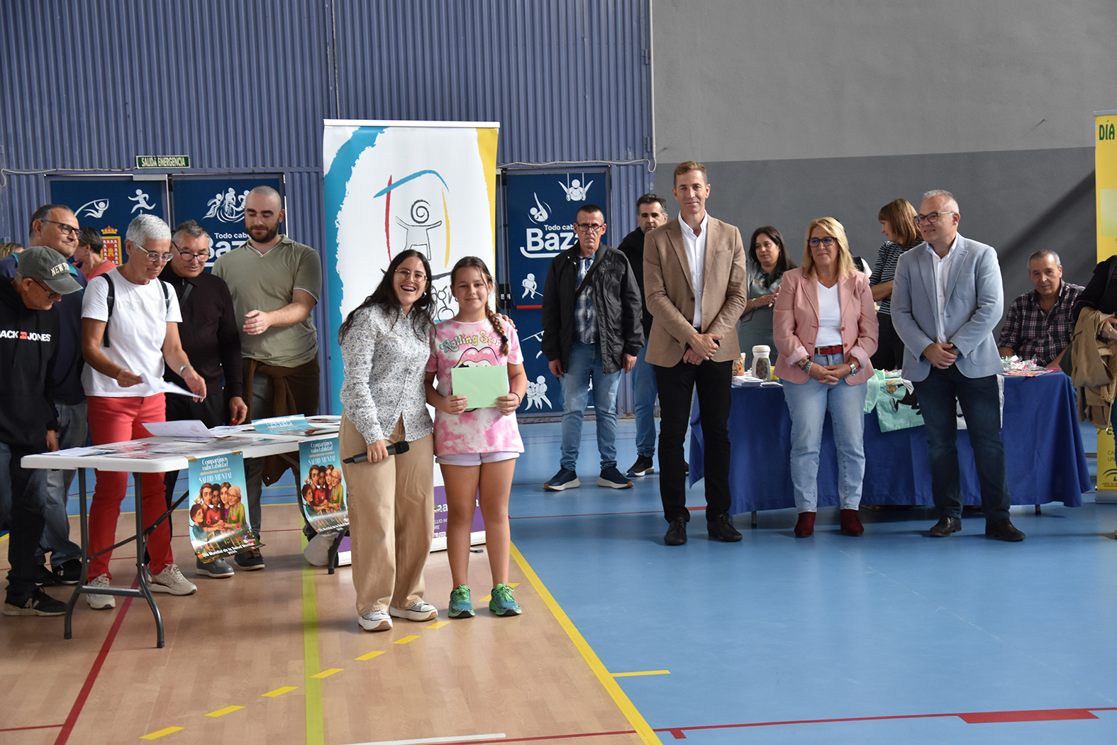 Acompañados por varias decenas de jóvenes, Afemagra y Faisem, entidades que trabajan en nuestra ciudad con personas con problemas de salud mental, han protagonizado en la mañana del 10 de octubre los actos de celebración del Día Mundial de la Salud Mental en Baza. La cita, prevista en principio en la Plaza Mayor, se desplazó hasta el pabellón municipal de deportes para evitar las previsiones de lluvia. Entre los numerosos asistentes se contó con la presencia de los alumnos de distintas aulas específicas de los centros de secundaria del municipio e incluso un stand informativo del proyecto Eracis+. También acudieron a la llamada el alcalde de Baza, Pedro J. Ramos, la concejala de Salud, Mª Carmen Sánchez, y el concejal que se ha hecho cargo de la concejalía de Bienestar Social durante la baja por embarazo de Priscila Martínez, Ramón López.
