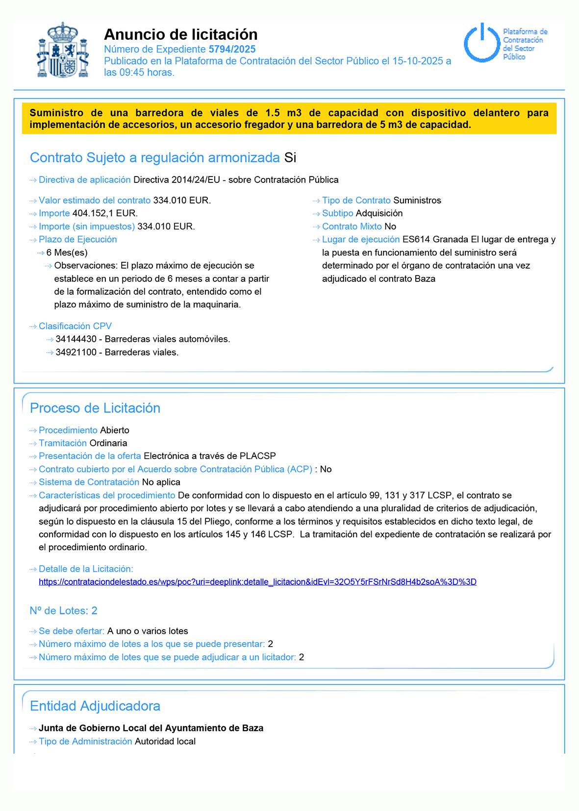 Ya se ha hecho efectivo, en la Plataforma de Contratación del Sector Público, el anuncio de licitación que rige la contratación del suministro de una barredora de viales de 1,5 metros cúbicos de capacidad, con dispositivo delantero para implementación de accesorios, un accesorio fregador y una barredora de 5 metros cúbicos de capacidad. El presupuesto base total de la licitación asciende a 404.152,10 euros, IVA incluido.
