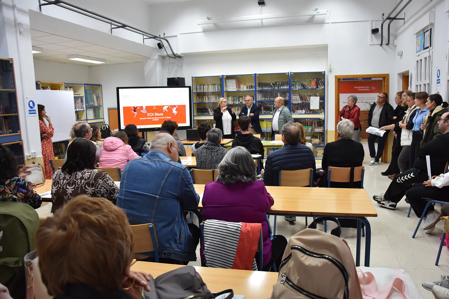 Con la presencia del alcalde de la ciudad, Pedro J. Ramos, y del concejal de Educación en funciones, José Gabriel López, en la tarde del martes 11 de noviembre se inauguraba el curso 2025-2026 en la Escuela Oficial de Idiomas de Baza, cuya denominación es “Ibn al-Qaysi al-Basti”. Los representantes municipales fueron recibidos por la directora del centro, Eva Mariño, quien los acompañó al salón de actos donde se desarrolló el acto con la presencia de varios grupos de alumnos y profesores.
