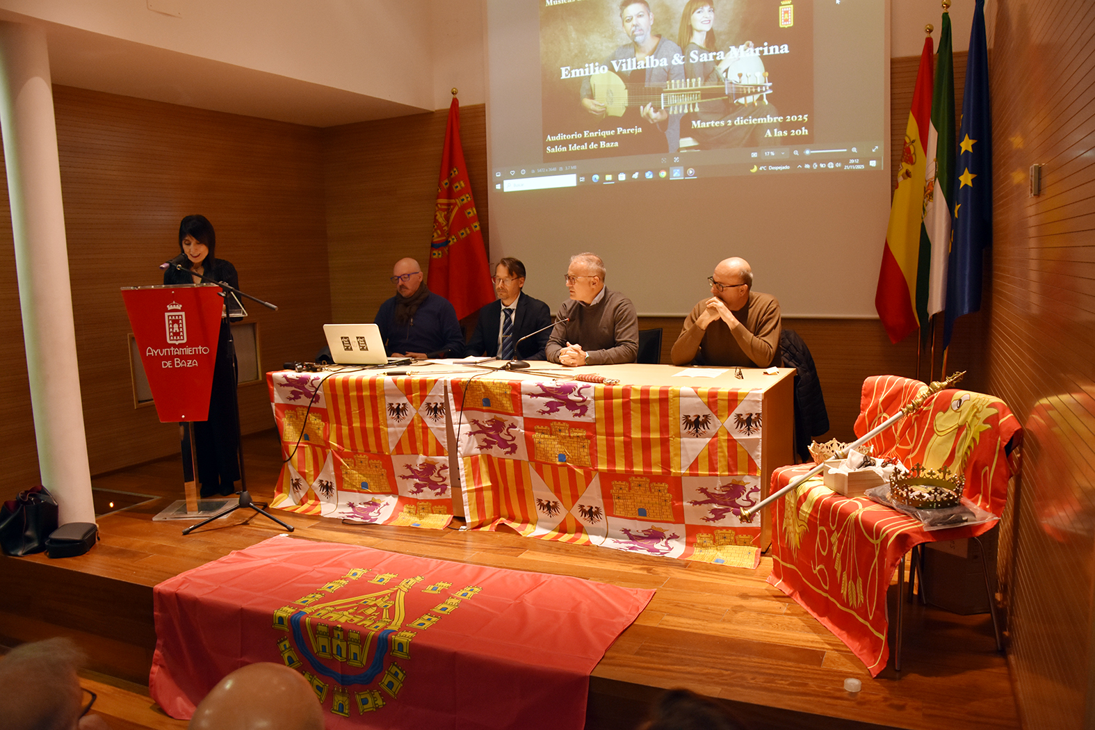 El acto, que estuvo presentado por Pilar Sola, comenzó con una breve intervención musical al compás de las dulzainas y el tambor, a cargo de Alejandro Baena, Estéfano Chaveli y Fran Chaveli, que también cerraron el encuentro. A continuación tomó la palabra el presidente de la nueva asociación, Víctor Martínez, que explicó cómo se había creado la entidad y sus principales pretensiones. Le siguió en el turno de intervenciones el experto en vexicología Miguel Amezcua, que adelantó algunas pinceladas de la conferencia que ofrecerá el viernes 28 de noviembre en este mismo escenario. Su intención fue abrir el interés por el episodio histórico sucedido en Baza allá por el 4 de diciembre de 1489. Continuó con el asunto de la reconquista bastetana el polifacético Alejandro Baena, maestro de profesión, quien ofreció una grabación del romance de la toma de Baza realizado con sus alumnos. Cerró el turno de palabra el alcalde de Baza, Pedro J. Ramos, agradecido por el trabajo realizado por la nueva asociación, a la que desde el principio se acogió con los brazos abiertos en el Ayuntamiento. El regidor incidió en la oportunidad que se abre para conocer este capítulo de nuestra historia y para aprovecharlo desde el punto de vista cultural como un reclamo más de nuestra ciudad. Acompañaron al alcalde el concejal de Cultura, José Gabriel López, y algunos miembros más del equipo de gobierno.