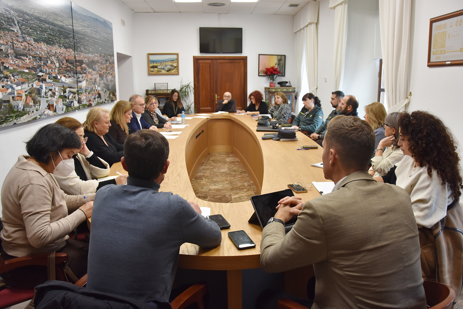 La Sala de Junta de Gobierno del Ayuntamiento de Baza acogió el viernes 19 de diciembre una nueva reunión de la Comisión, un encuentro que estuvo presidido por el alcalde de la ciudad, Pedro J. Ramos, y que contó con la presencia de la coordinadora provincial del IAM en Granada, Teresa Illescas, y de la Jefa de la unidad Contra la Violencia sobre la Mujer de la Subdelegación del Gobierno en la provincia, Montserrat Muñoz. Junto a ellos hubo representación también de los Servicios Sociales municipales, de la AGS Nordeste de Granada, del CEP, de las Fuerzas de Seguridad, de la Abogacía, asociaciones que trabajan en este asunto, etc.