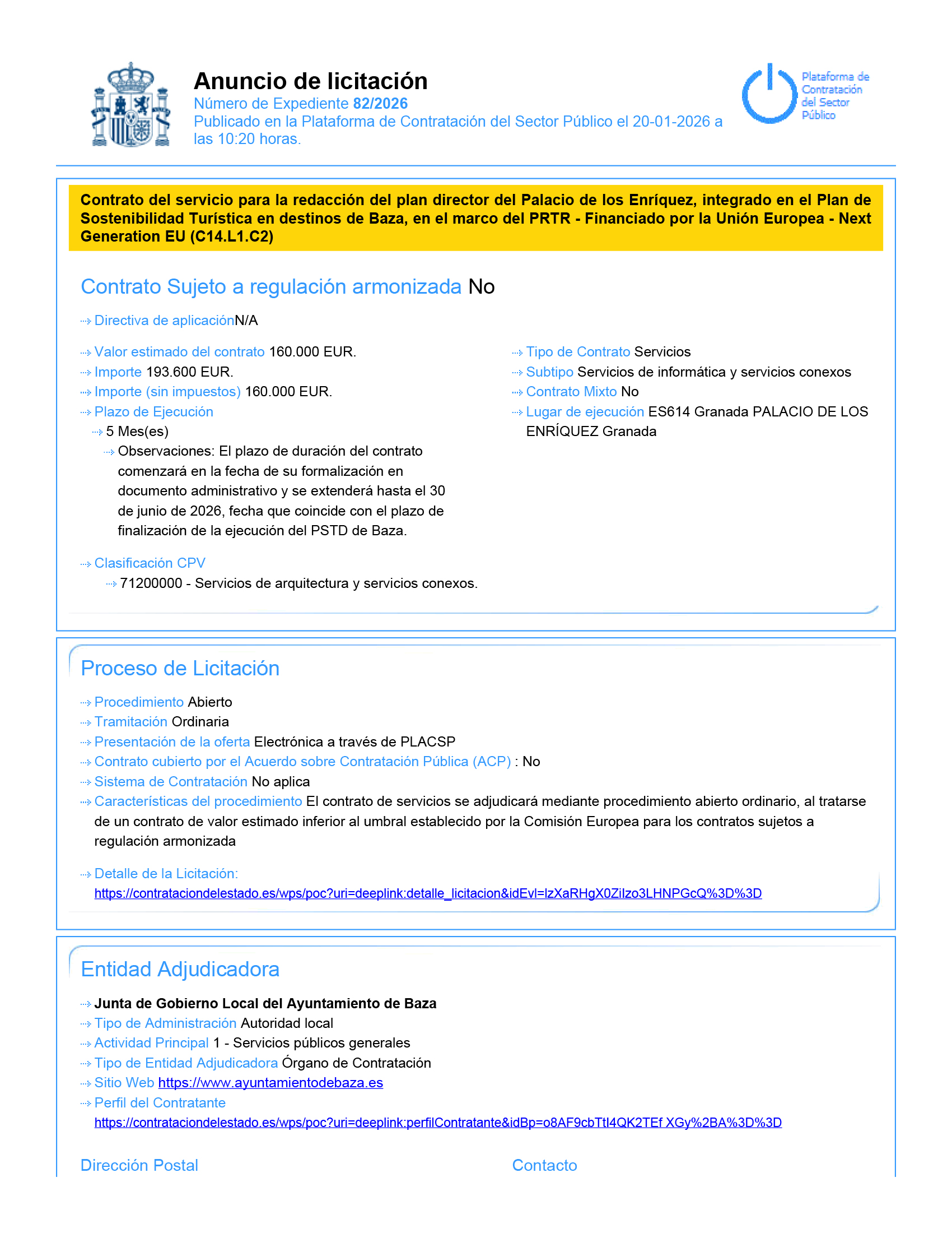 La Plataforma de Contratación del Sector Público tiene ya publicado el anuncio de licitación que rige la contratación del servicio para la redacción del Plan Director del Palacio de los Enríquez, integrado en el Plan de Sostenibilidad Turística en Destino de Baza, en el marco del PRTR-Financiado por la Unión Europera-Next Generation EU (C14.L1.C2)