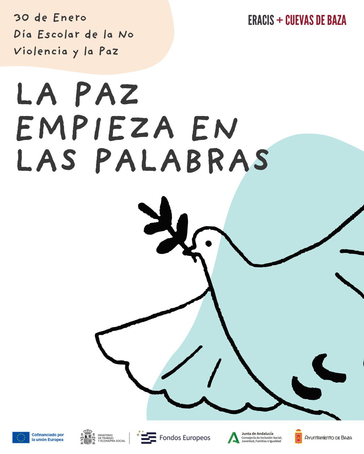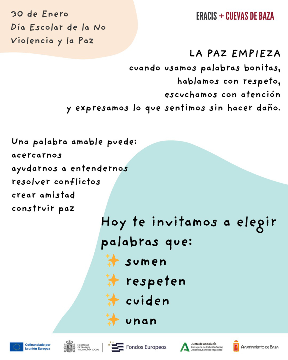 Desde el Programa ERACIS+, cofinanciado por el Fondo Social Europeo Plus y la Consejería de Inclusión Social, Juventud, Familias e Igualdad de la Junta de Andalucía, nos sumamos a la conmemoración del Día Escolar de la No Violencia y la Paz, reafirmando nuestro compromiso con la construcción de una sociedad más justa, respetuosa y cohesionada.