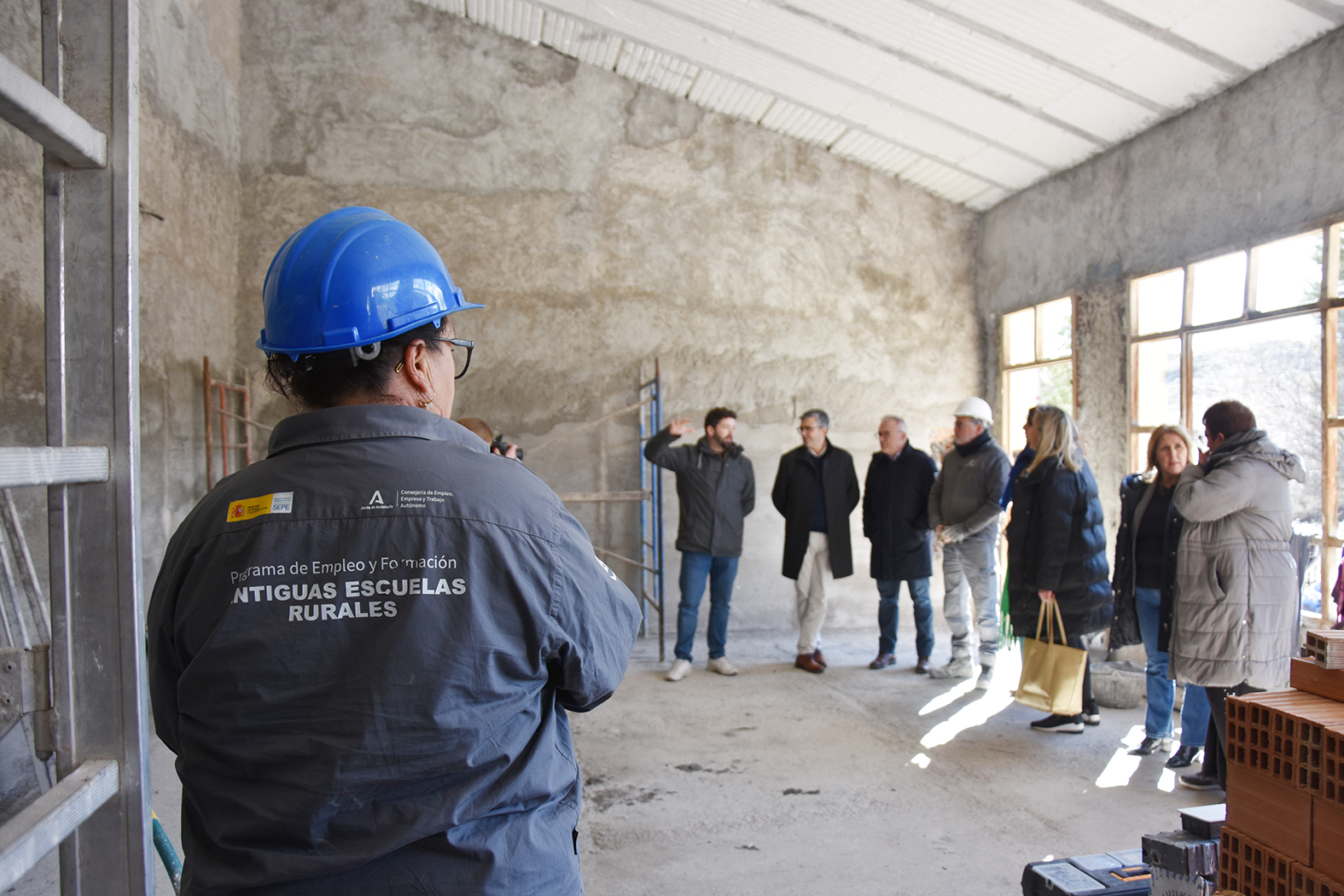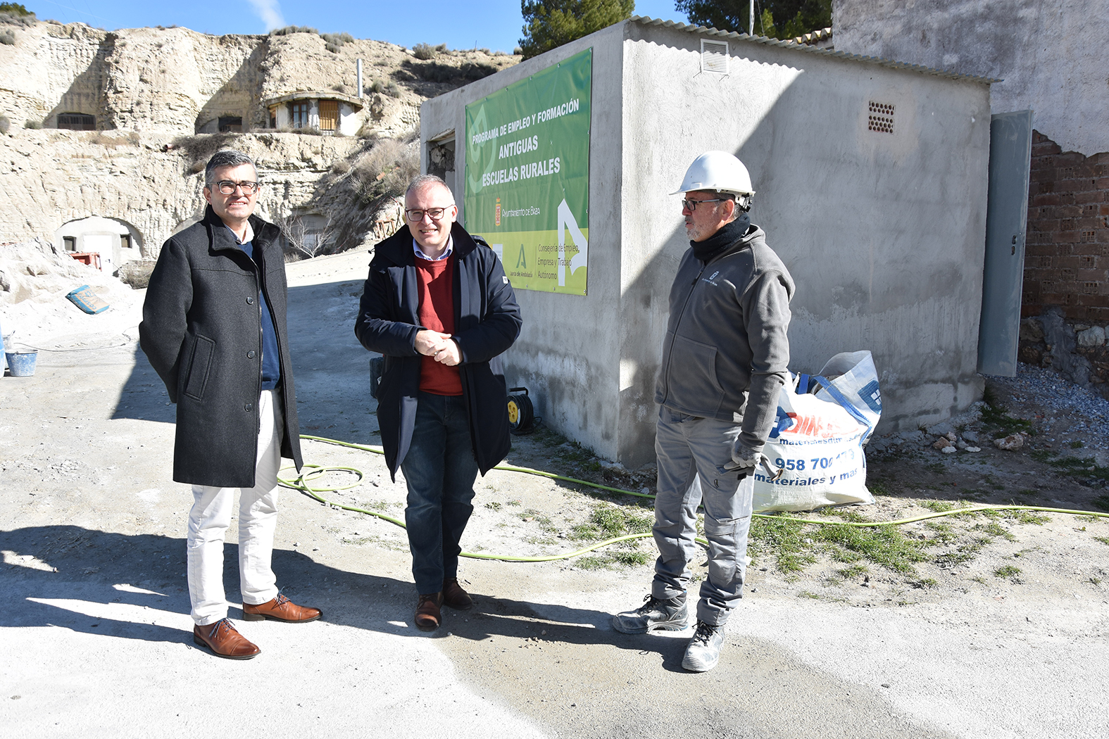 El alcalde de Baza, Pedro J. Ramos, ha acompañado en la mañana del jueves 19 de febrero al delegado territorial de Empleo, Empresa y Trabajo Autónomo de la Junta de Andalucía en Granada, Javier Martín, en la visita que ha realizado a las antiguas escuelas del barrio Perchel, donde el Programa de Empleo y Formación “Antiguas Escuelas Rurales”, concedido por la Consejería de Empleo al Ayuntamiento el pasado año con una financiación de 433.024 euros, está desarrollando sus prácticas.