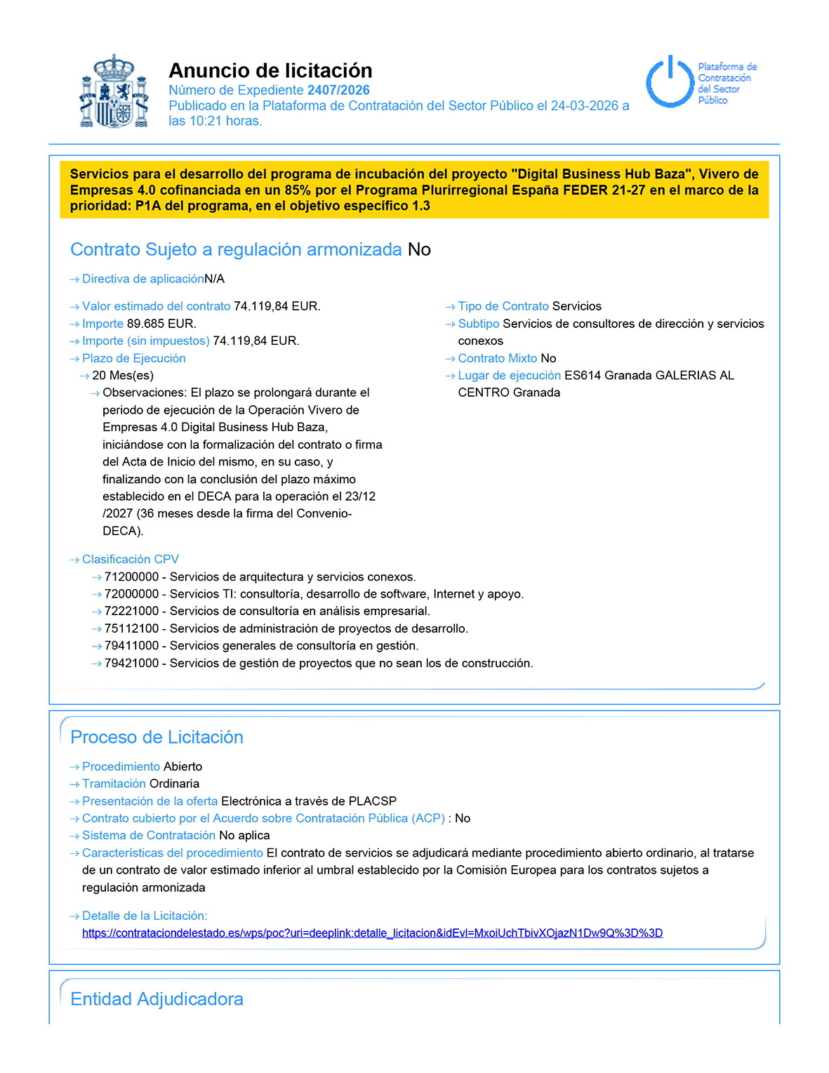 La Plataforma de Contratación del Sector Público tiene ya publicado el anuncio de licitación que rige la contratación de los servicios para el desarrollo del programa de incubación del proyecto “Digital Business Hub Baza”, Vivero de Empresas 4.0, cofinanciado en un 85% por el Programa Plurirregional España FEDER 21-27 en el marco de la prioridad: P1A del programa, en el objetivo específico 1.3.
