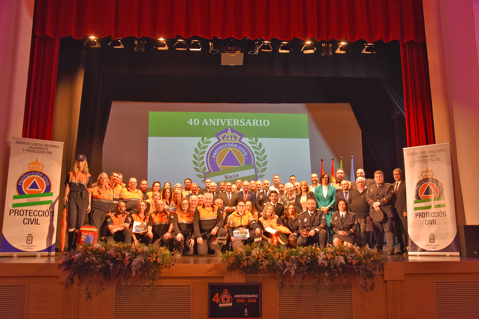 El teatro Dengra acogió en la mañana del domingo 19 de abril un emotivo acto institucional de homenaje y reconocimiento a la Agrupación de Voluntarios de Protección Civil, que en este 2026 celebra sus primeros cuarenta años de existencia. Presidido por el alcalde de Baza, Pedro J. Ramos, y por la concejala de Gobernación del Ayuntamiento, Mª Carmen Sánchez, el majestuoso espacio escénico reunió a gran parte de los actuales integrantes de la Agrupación, así como a antiguos componentes, cargos políticos municipales que han estado al cargo de este servicio, familiares y amigos. En representación de otras administraciones participaron la delegada territorial de Desarrollo Educativo en Granada de la Junta de Andalucía, Mª José Martín, el diputado provincial de Asistencia a Municipios y Emergencias, Eduardo Martos, y el Jefe del Servicio de Emergencias de la Diputación provincial, Sergio Jiménez. Entre los invitados estuvieron también algunos miembros de la corporación municipal bastetana, algunos alcaldes de la comarca y representantes de asociaciones y entidades de la ciudad.