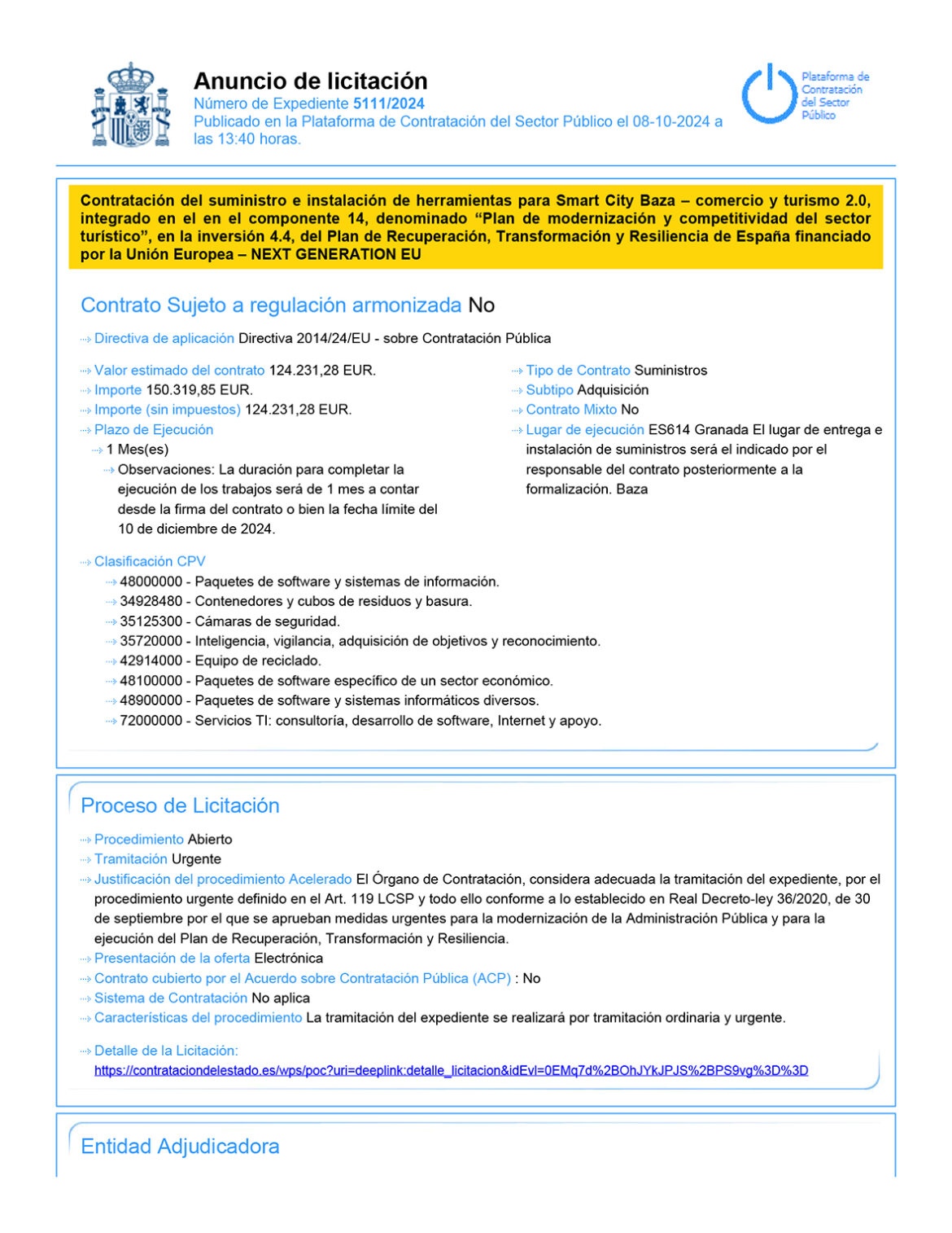 La Plataforma de Contratación del Sector Público ha publicado ya el anuncio de licitación que rige la contratación del suministro e instalación de herramientas para Smart City Baza – comercio y turismo 2.0, integrado en el componente 14, denominado “Plan de modernización y competitividad del sector turístico”, en la inversión 4.4, del Plan de Recuperación, Transformación y Resiliencia de España financiado por la Unión Europea – NEXT GENERATION EU