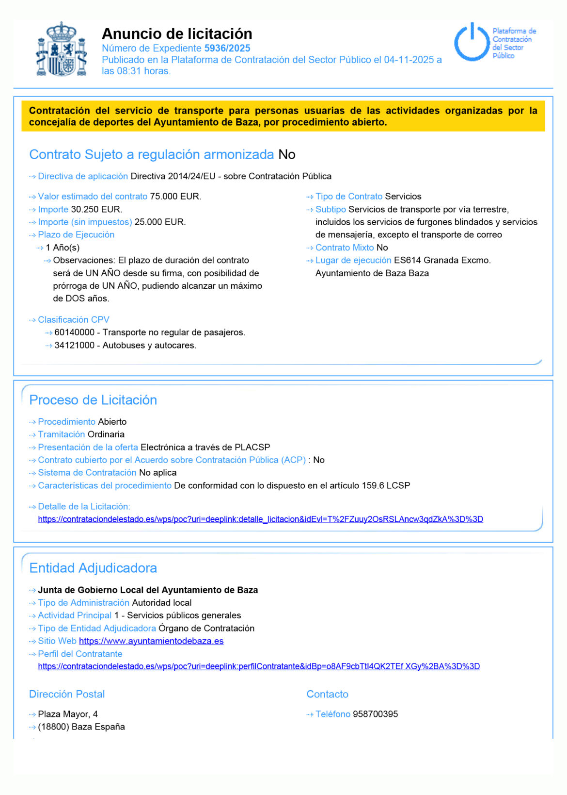 La Plataforma de Contratación del Sector Público tiene ya publicado el anuncio de licitación que rige la contratación del servicio de transporte para personas usuarias de las actividades organizadas por la concejalía de Deportes del Ayuntamiento de Baza, una gestión que se realiza por procedimiento abierto. El presupuesto base de licitación es de 30.250 euros, IVA incluido.