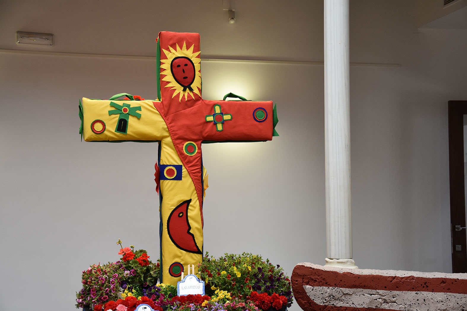 La Cruz representa el traje del Cascamorras, uno de los grandes símbolos de la ciudad. Sus colores —rojo, verde y amarillo— transmiten vitalidad, pero en esta ocasión adquieren un significado aún más profundo, ya que la Cruz reproduce con minucioso detalle la chaquetilla del personaje, funcionando como una auténtica réplica artística. Por ello, la visita se plantea como una experiencia envolvente. Se invita al espectador a recorrer la Cruz como si de una girándola se tratara, rodeándola para descubrir cada detalle, símbolo y matiz. No es solo una obra para contemplar, sino para explorar.