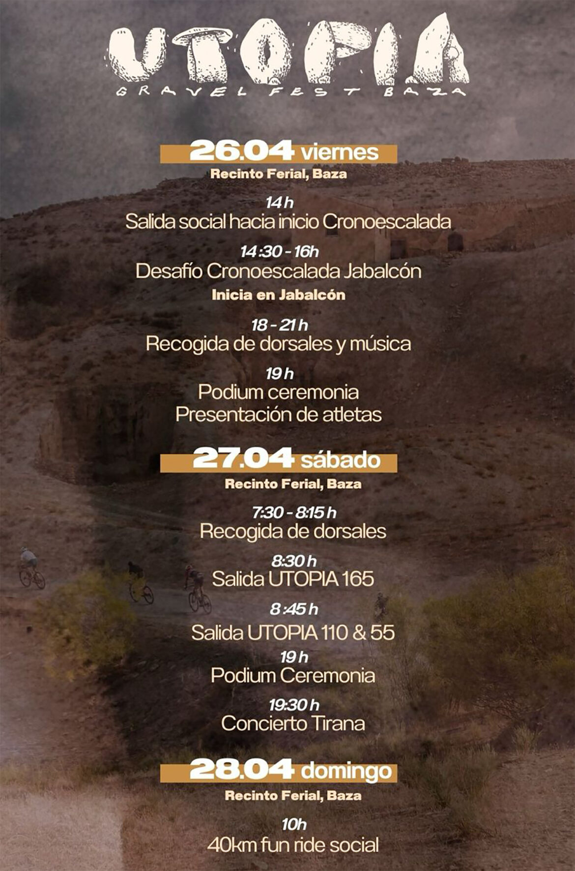El evento comenzará el viernes 26 de abril con una desafiante cronoescalada al Jabalcón, seguida de un día completo de acción, el sábado, con rutas de 55, 110 o 165 kilómetros diseñadas para desafiar incluso a los ciclistas más experimentados. Se trata de una actividad pública a la que todo el mundo está invitado a acercarse, especialmente al Recinto Ferial para disfrutar de música y buen ambiente durante la tarde del sábado. Uno de los reclamos más destacados de este “Utopia Gravel Fest” es la presencia del ciclista David Valero.