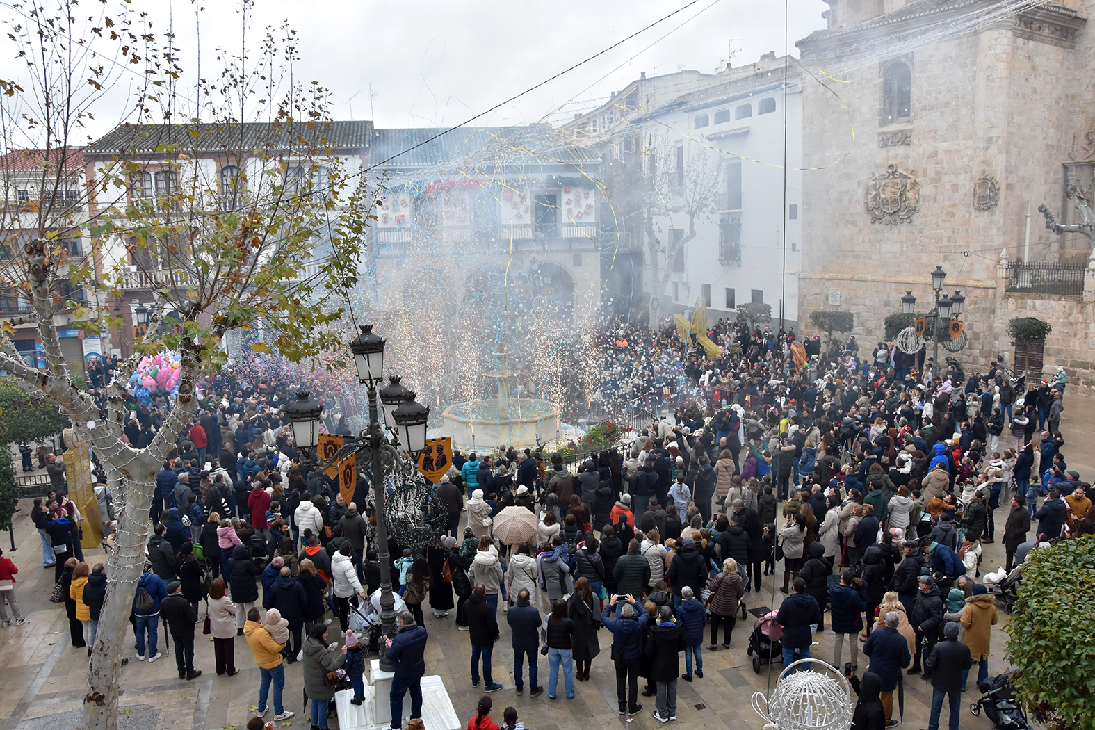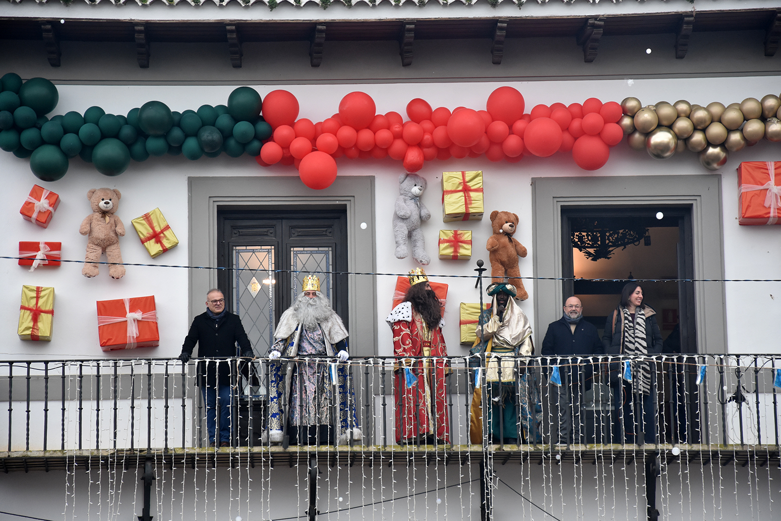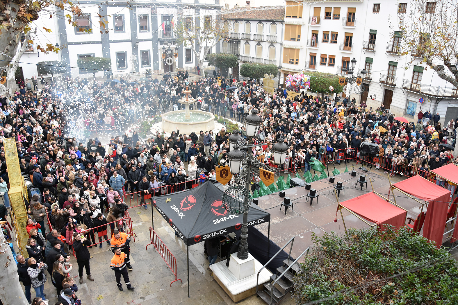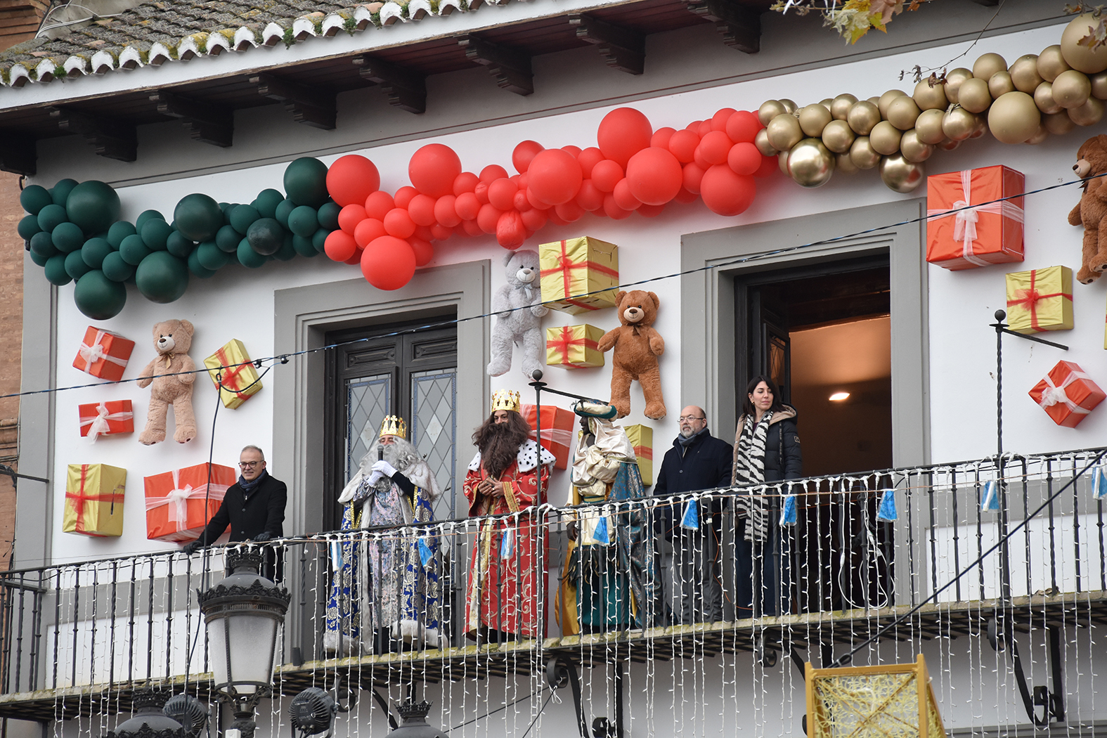 A su llegada a la Plaza Mayor, en el balcón del Museo, los Reyes recibieron la bienvenida oficial del alcalde de Baza, Pedro J. Ramos, y saludaron a los cientos de personas que se dieron cita para verlos de cerca. Tras un espectáculo de luz, sus majestades se situaron en sus tronos y entregaron a los más pequeños un obsequio.