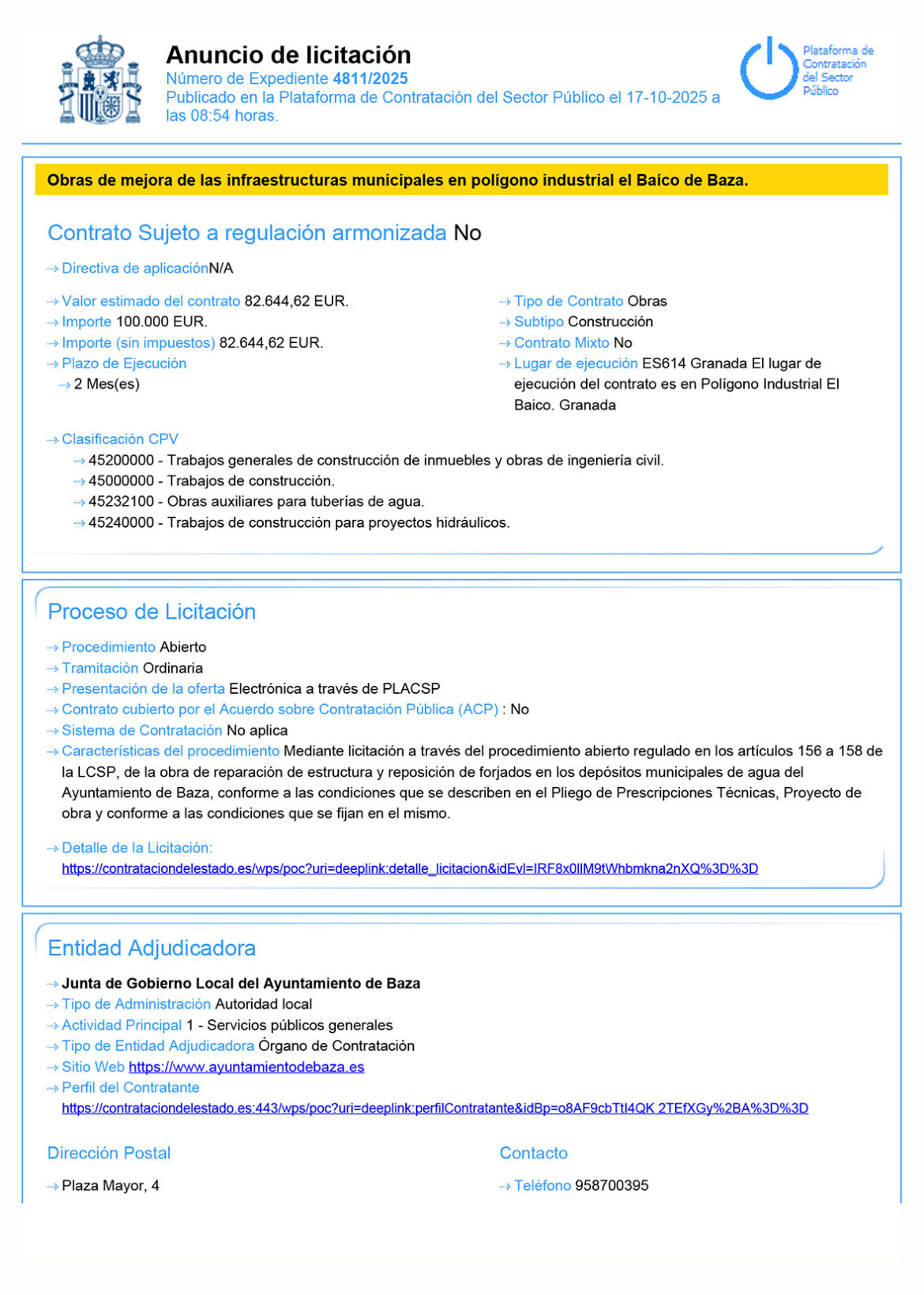 La Plataforma de Contratación del Sector Público tiene ya publicado el anuncio de licitación que rige la contratación del seguro privado de Accidentes Colectivos del Ayuntamiento de Baza, que se …