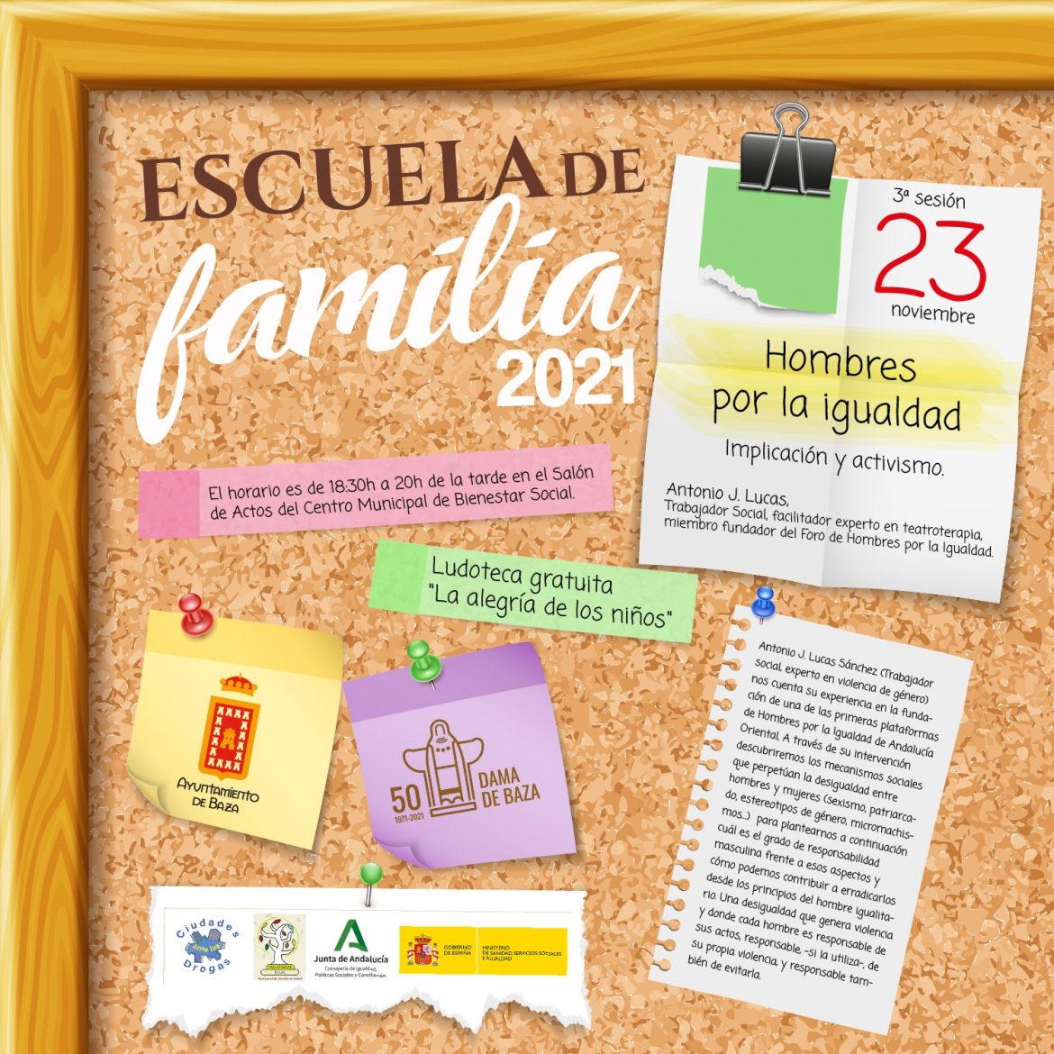 La Escuela Municipal de Familia que organiza el Ayuntamiento de Baza a través del área de Bienestar Social, Igualdad, Mujer, Salud, Deporte y Juventud continúa el 23 de noviembre con una nueva sesión titulada “Hombres por la igualdad. Implicación y activismo”. En ella se contará con la participación de Antonio J. Lucas, trabajador social experto en violencia de género, quien contará su experiencia en una de las primeras plataformas de Hombres por la Igualdad de Andalucía Oriental.