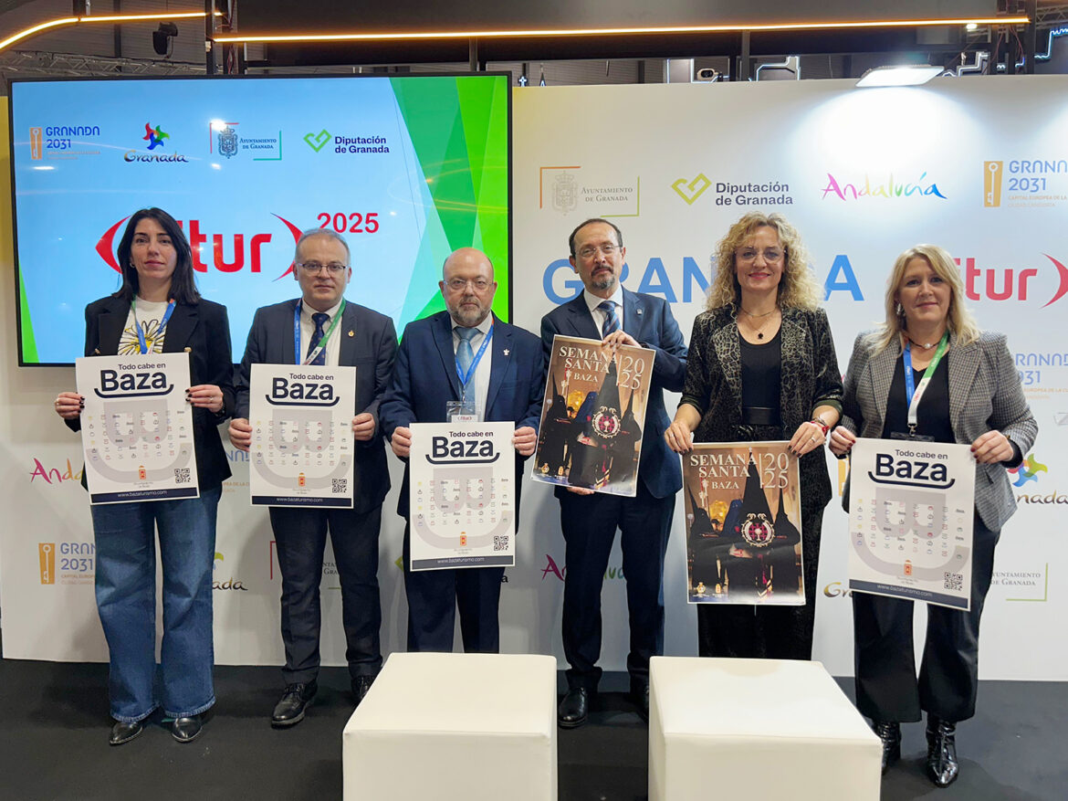 El alcalde se mostró agradecido a las distintas administraciones que están colaborando con la ciudad en su desarrollo turístico y calificó como “un paso más” la visita a Fitur de este 2025. Ramos quiso dejar claro que para su equipo de gobierno el turismo es un eslabón imprescindible en el desarrollo económico de Baza y desgranó algunas de las intervenciones que se están realizando en este sentido, como la remodelación y modernización que se está realizando en la Oficina Municipal de Turismo o la inminente puesta en marcha de la plaza de Técnico de Turismo en el consistorio. En el concejal recayó la responsabilidad de descubrir la oferta con la que Baza se presentaba este año en Fitur. “Todo cabe en Baza” es la nueva marca de ciudad que también sirve para el turismo, porque Baza tiene enormes posibilidades y solo hay que elegir, dependiendo de nuestras circunstancias. Las intervenciones de nuestros representantes concluyeron con la proyección de un video que se ha preparado para esta cita donde se resume el mensaje sobre la versatilidad turística de Baza. Antes de concluir el acto, el delegado de Turismo de la Junta en Granada destacó la historia, cultura y naturaleza de Baza y su “capacidad para conjugar su patrimonio troglodita con la belleza íbera de su museo, la concatedral y el Cascamorras, su fiesta mayor”, al tiempo que resaltó la oportunidad que el Geoparque ofrece para el turismo de naturaleza y deporte. Egea elogió también el esfuerzo del Ayuntamiento por recuperar el Palacio de los Enríquez como muestra del compromiso con la preservación de la historia local y ha resaltado que “Baza es un lugar por explorar que abre universos amplios para el turismo”. Aprovechando el momento de las fotos con los medios de comunicación, todas las autoridades se sumaron a la presentación del cartel oficial de la Semana Santa de Baza 2025, sobre la que también se escucharon palabras de reconocimiento.
