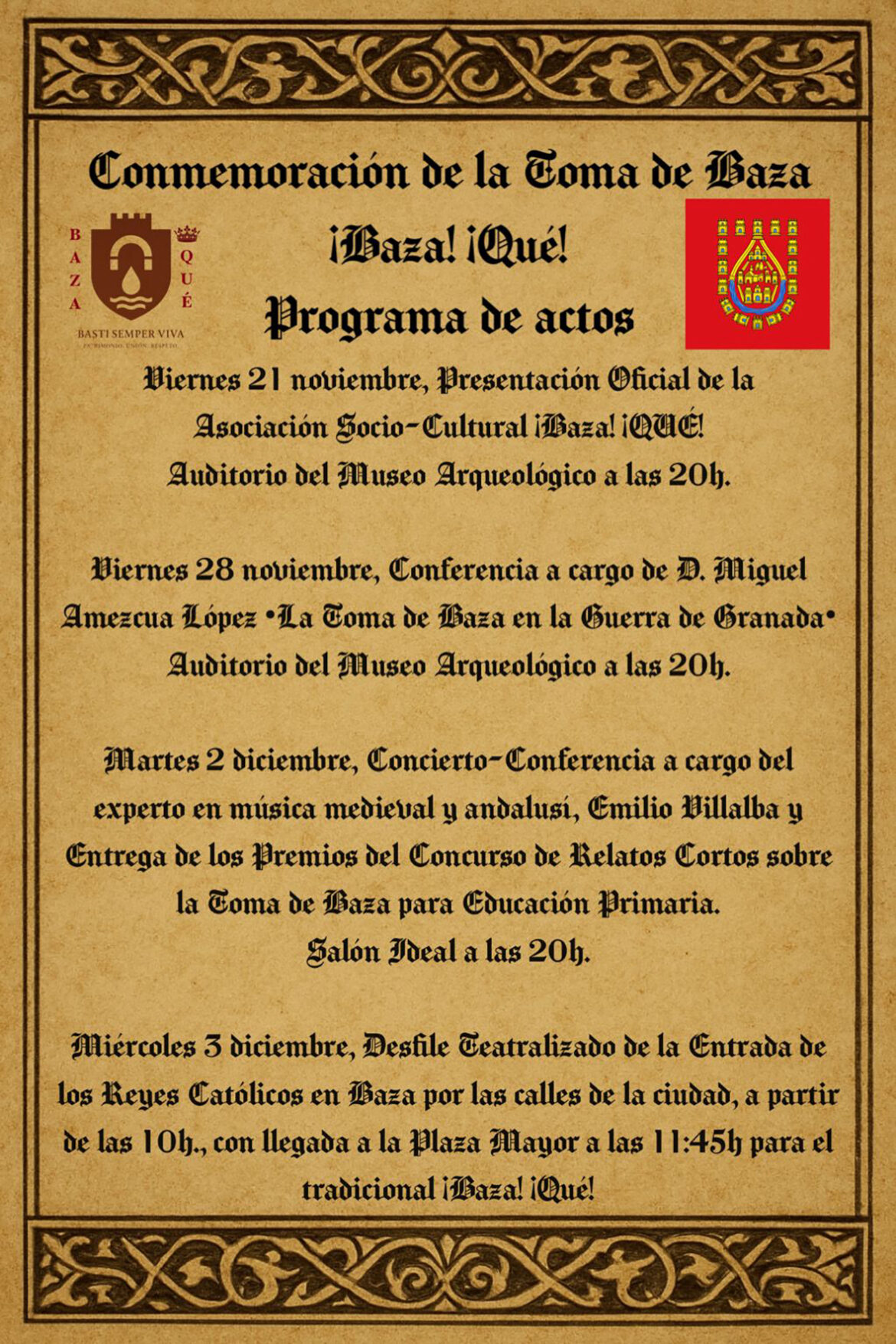 Además del desfile teatralizado en la mañana del 3 de diciembre, la conmemoración de la Toma de Baza trae consigo algunas otras actividades que comenzarán el viernes 21 de noviembre con la presentación oficial de la asociación en el auditorio del Museo a las 20:00h. Una semana después, el viernes 28 de noviembre, a las 20:00h., se ofrecerá en el mismo lugar una conferencia “La Toma de Baza en la guerra de Granada” a cargo de Miguel Amezcua López. Finalmente, el martes 2 de diciembre se celebrará un concierto-conferencia a cargo del experto en música medieval y andalusí, Emilio Villalba. El acto se aprovechará para la entrega de los premios del concurso de relatos cortos sobre la Toma de Baza que se está celebrando en la etapa de Primaria de los centros escolares de la ciudad. En este caso, este acto se celebrará en el salón Ideal a partir de las 20:00h.