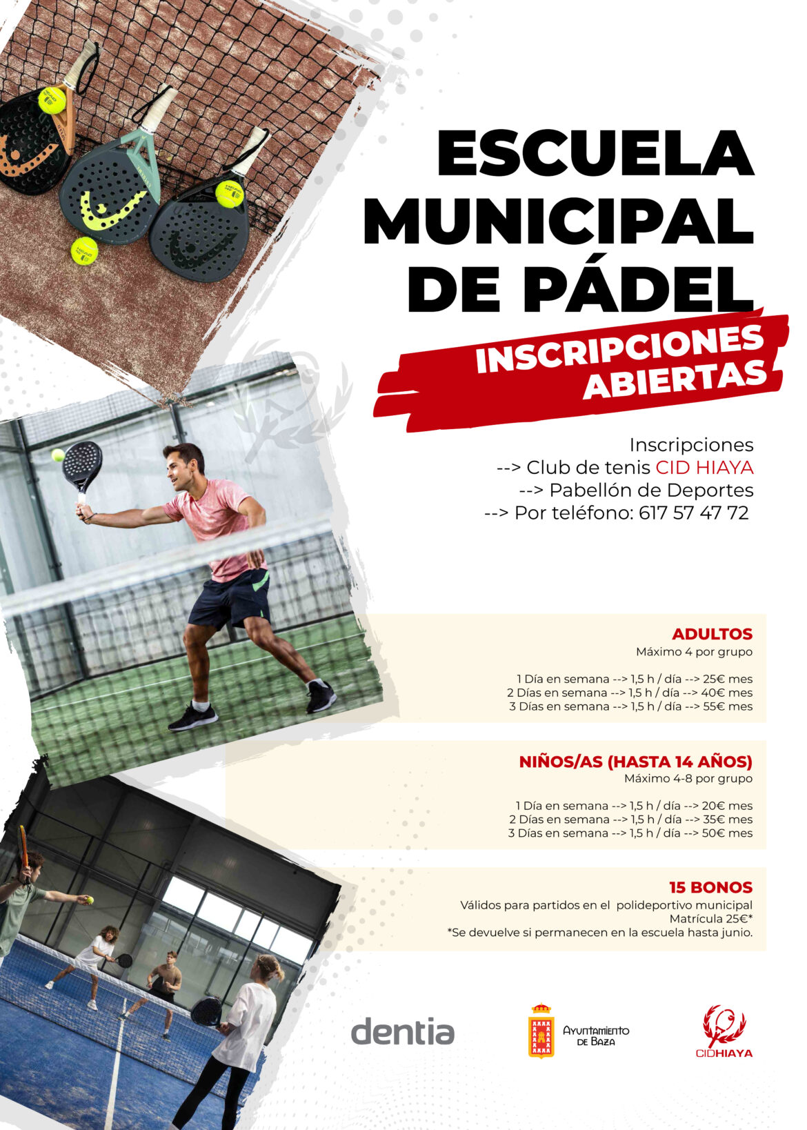 Ya está todo preparado para que eche a andar la Escuela Municipal de Pádel que ha preparado el Ayuntamiento de Baza. El plazo de inscripción está abierto y el inicio de las sesiones se ha previsto para el jueves 2 de noviembre. Los interesados pueden dirigirse para formalizar su plaza al Club de Tenis “Cid Hiaya”, al pabellón municipal de deportes o al número de teléfono 617 574 772. De hecho, este sábado, 28 de octubre, se celebrará una jornada de puertas abiertas en el Club de Tenis “Cid Hiaya” de 10:00 a 13:00 horas para aclarar dudas, para informarse y para conocer las instalaciones donde se desarrollará esta Escuela Municipal de Pádel. Para asistir a ella hay que confirmar en el número arriba indicado.