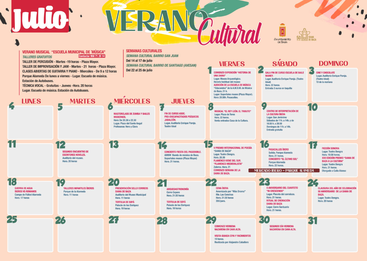 La programación cultural estival diseñada por el Ayuntamiento de Baza para los meses de julio y agosto se ha recopilado en un calendario para facilitar una visión global de las diferentes actividades propuestas y animar a la ciudadanía a no perderse nada. Son cerca de medio centenar las propuestas programadas, con los espacios al aire libre de la ciudad como protagonistas y con el objetivo de favorecer la actividad económica y comercial en establecimientos de restauración y comercios.