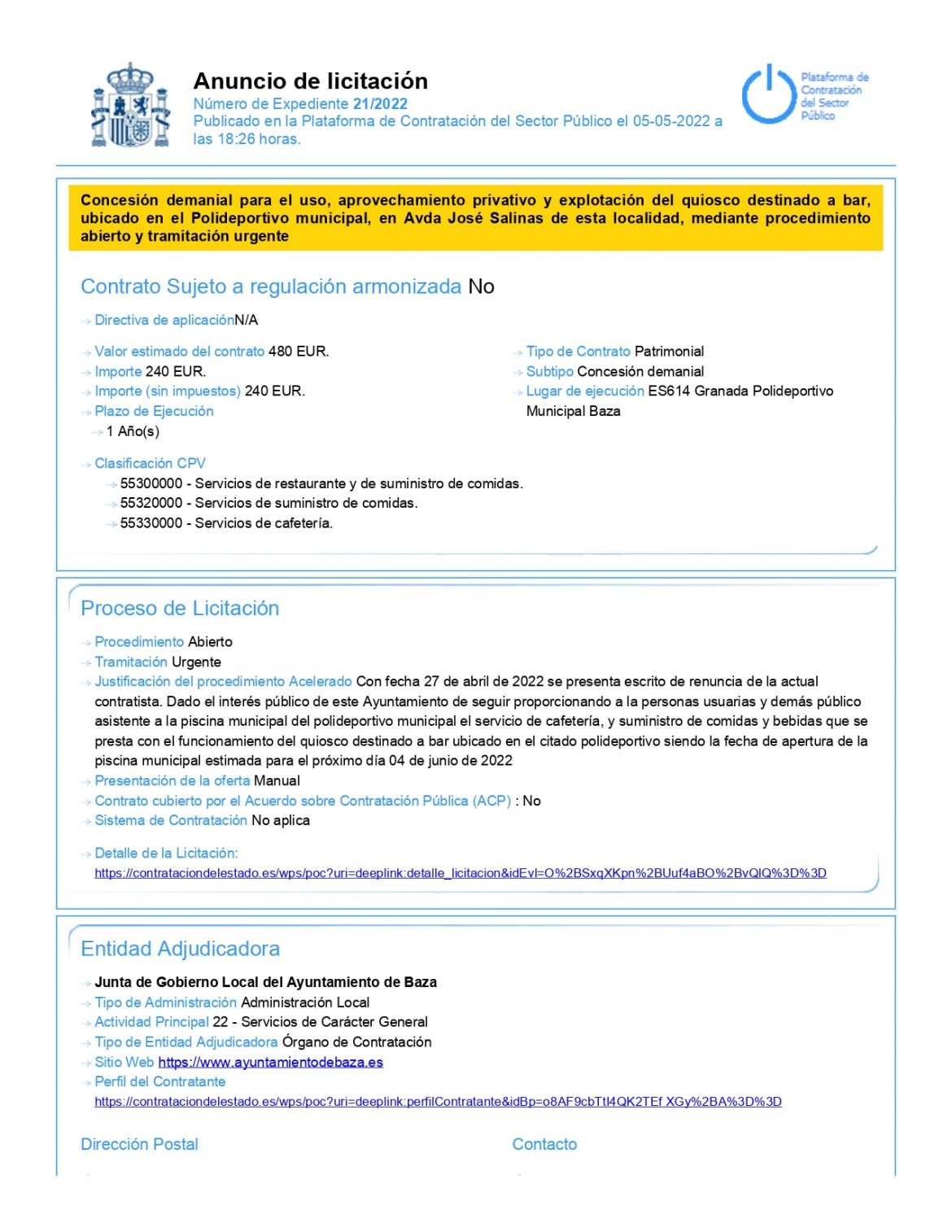 El Ayuntamiento de Baza informa que se han publicado en la Plataforma de Contratación del Sector Público los pliegos y condiciones que rigen el procedimiento de licitación para la concesión demanial para el uso, aprovechamiento privativo y explotación del quiosco destinado a bar de titularidad municipal ubicado en el polideportivo, por procedimiento abierto y tramitación de urgencia. Las ofertas se podrán presentar hasta las 15h del 13 de mayo de 2022 en el Registro General de entrada de este Ayuntamiento. En el siguiente enlace se pueden descargar los pliegos y condiciones que rigen esta licitación: