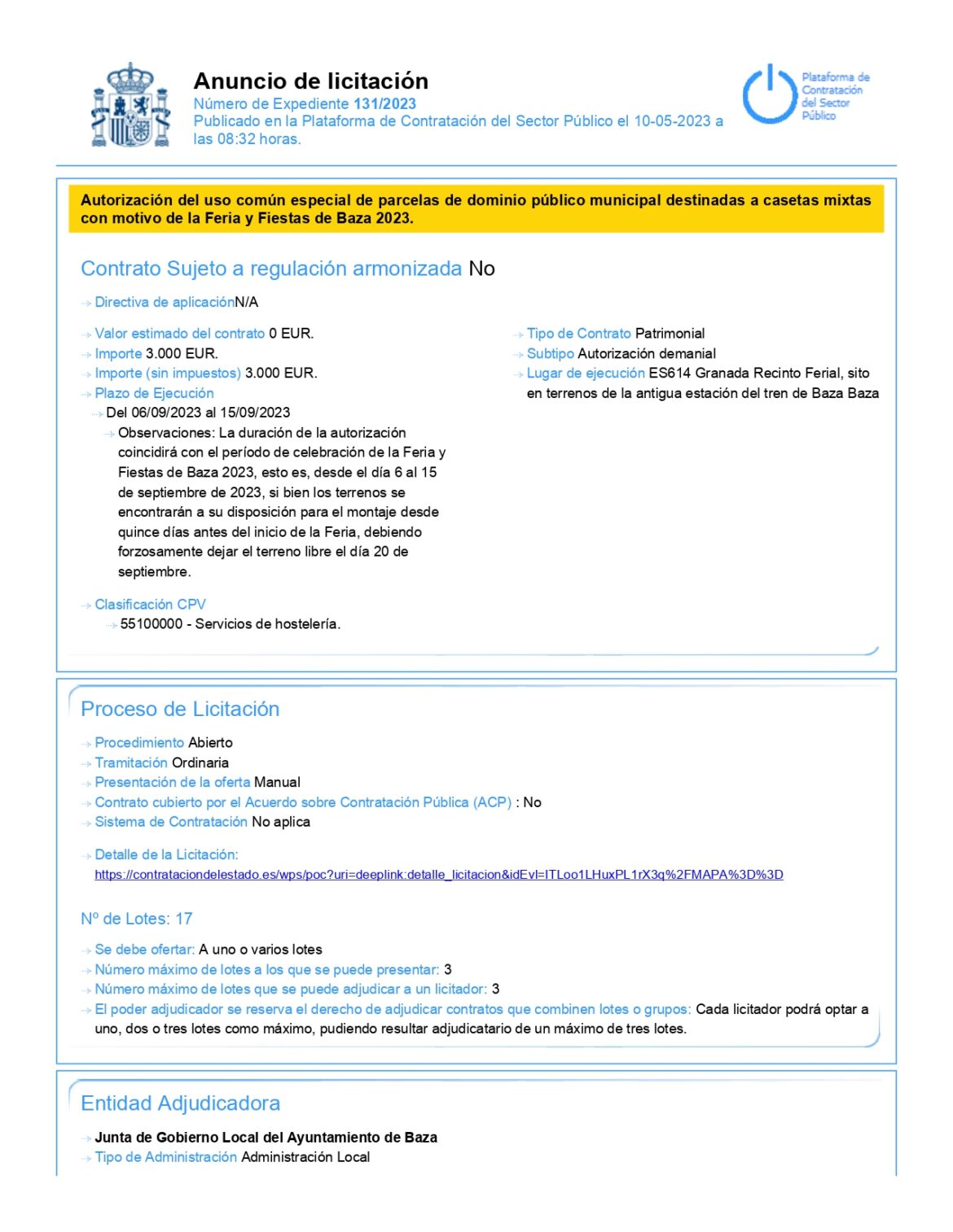 También están publicados en la Plataforma de Contratación del Sector Público los pliegos y condiciones para la autorización del uso común especial de parcelas de dominio público municipal destinadas a casetas mixtas con motivo de la Feria y Fiestas de Baza 2023. El plazo de presentación de ofertas es hasta las 15h del 25 de mayo. Enlace: