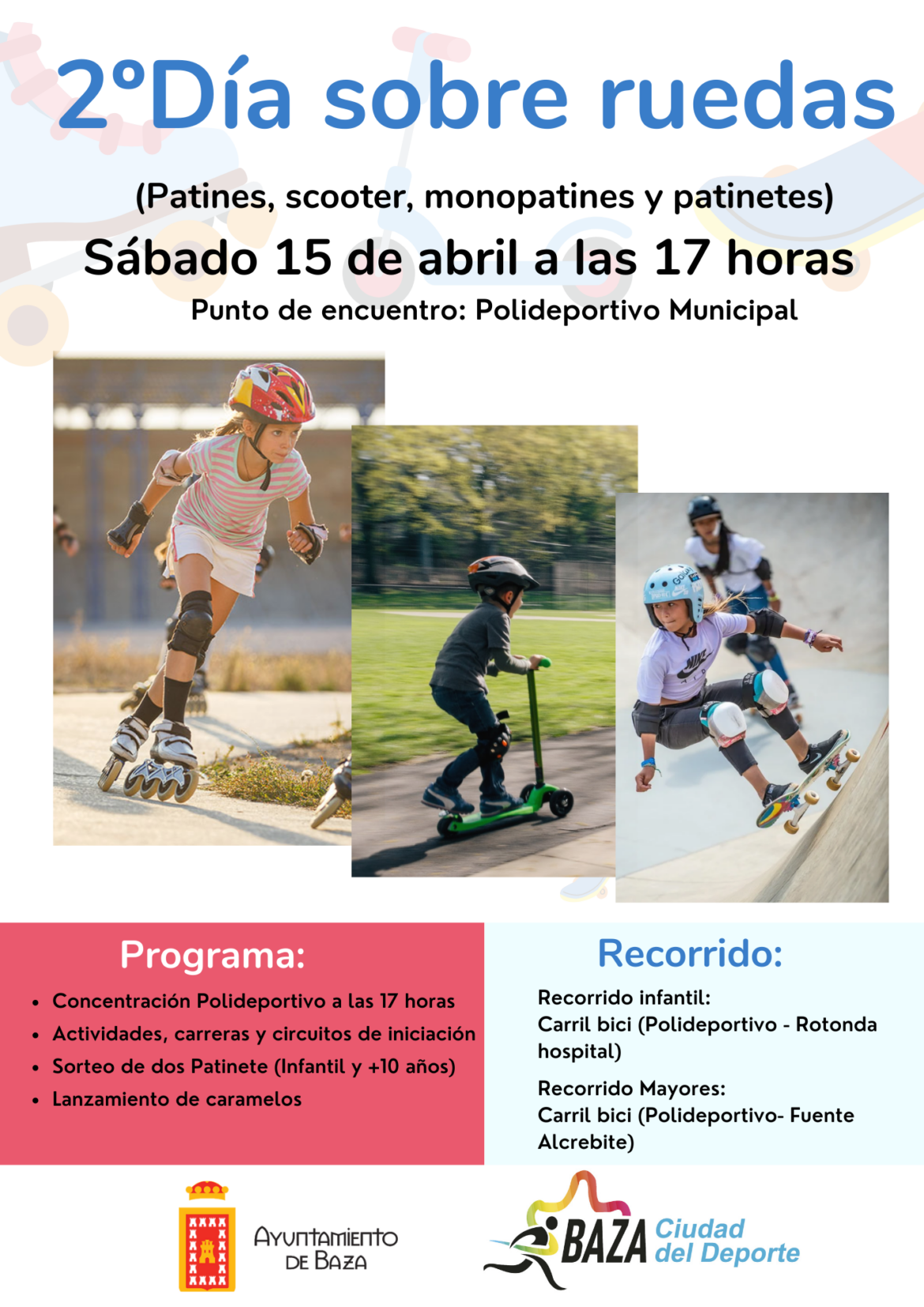 Baza celebrará este sábado 15 de abril la 2ª edición del Día sobre Ruedas, una actividad gratuita y abierta a todas aquellas personas a las que les guste deslizarse sobre el asfalto y pensada para disfrutar con patines, patinetes y monopatines. EL punto de encuentro será el Skate Park del polideportivo municipal a las 17h. Desde allí se han establecido dos itinerarios que trascurrirán por los carriles bici existentes: habrá un recorrido para menores de 6 años y otro para mayores de 6 años. Para completar la actividad, después de los recorridos se realizarán actividades, circuitos de iniciación, un sorteo de dos patinetes y el lanzamiento de caramelos.