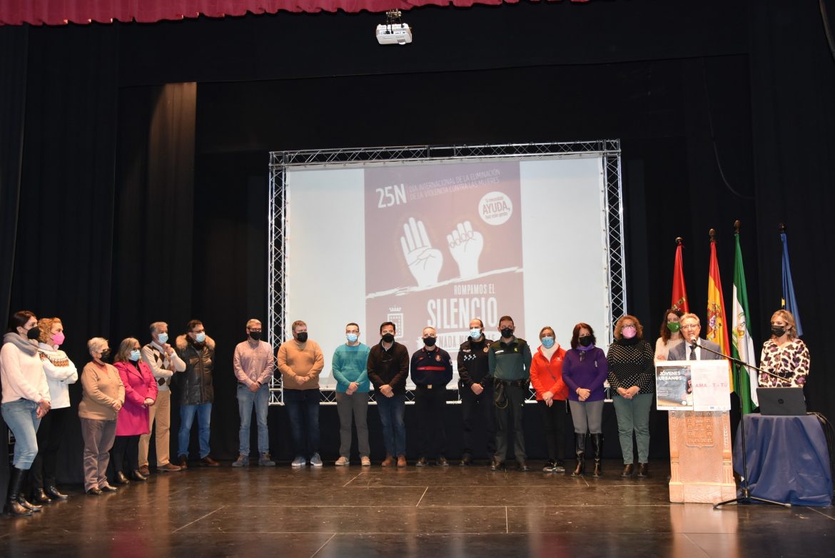 Sobre el escenario se encontraban representantes de las fuerzas y cuerpos de seguridad, del CEP en representación de la comunidad educativa, de las Asociaciones de Mujeres Amudima y Clara Campoamor, de otras asociaciones implicadas como Afemagra, Cruz Roja y Cáritas, del Área Sanitaria Nordeste de Granada y de la corporación municipal. Y entre el público, muchos chicos y chicas de los centros educativos de secundaria de la ciudad, además de representantes de diferentes colectivos, trabajadores municipales de los diferentes servicios dedicados a la atención de mujeres (Bienestar Social y CMIM) y ciudadanía en general.