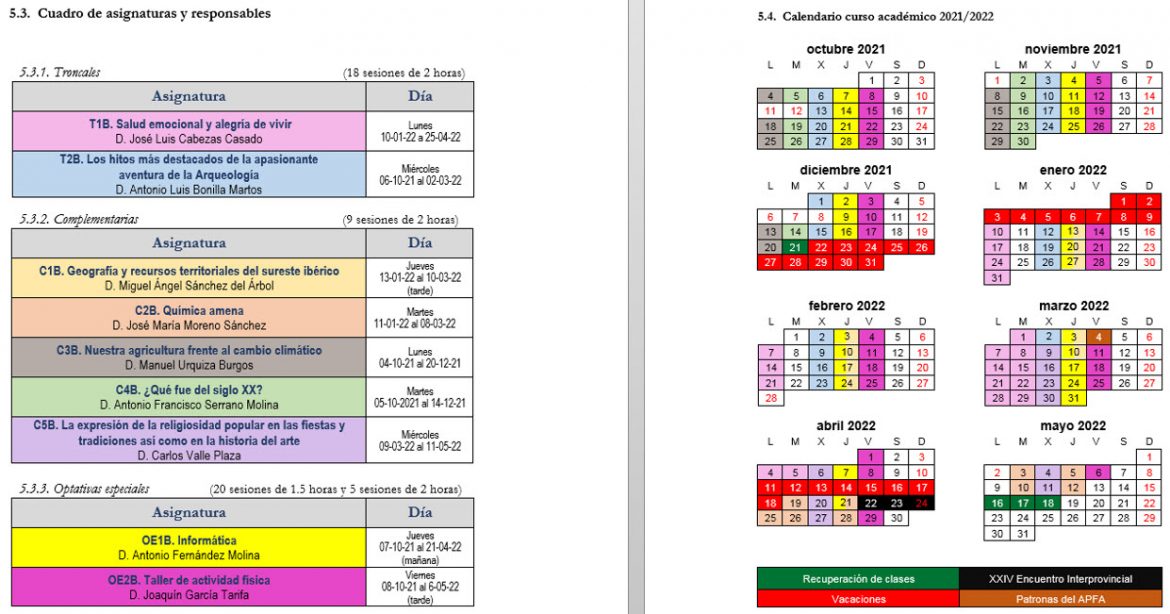 Durante el curso académico se imparten asignaturas troncales, opcionales y opcionales especiales, que se completan con actividades extraescolares tales como, viajes, excursiones y de voluntariado cultural (en este curso, lógicamente, adaptadas a la situación generada por la pandemia). Como asignaturas troncales, el nuevo curso oferta las de “Salud emocional y alegría de vivir” y “Los hitos más destacados de la apasionante aventura de la arqueología”. Como complementarias se impartirán “Geografía y recursos territoriales del sureste ibérico”, “Química amena”, “Nuestra agricultura frente al cambio climático”, “¿Qué fue del siglo XX?” y “La expresión de la religiosidad popular en las fiestas y tradiciones, así como en la historia del arte”. Por último, se ofertan como optativas especiales “Informática” y “Taller de actividad física”.