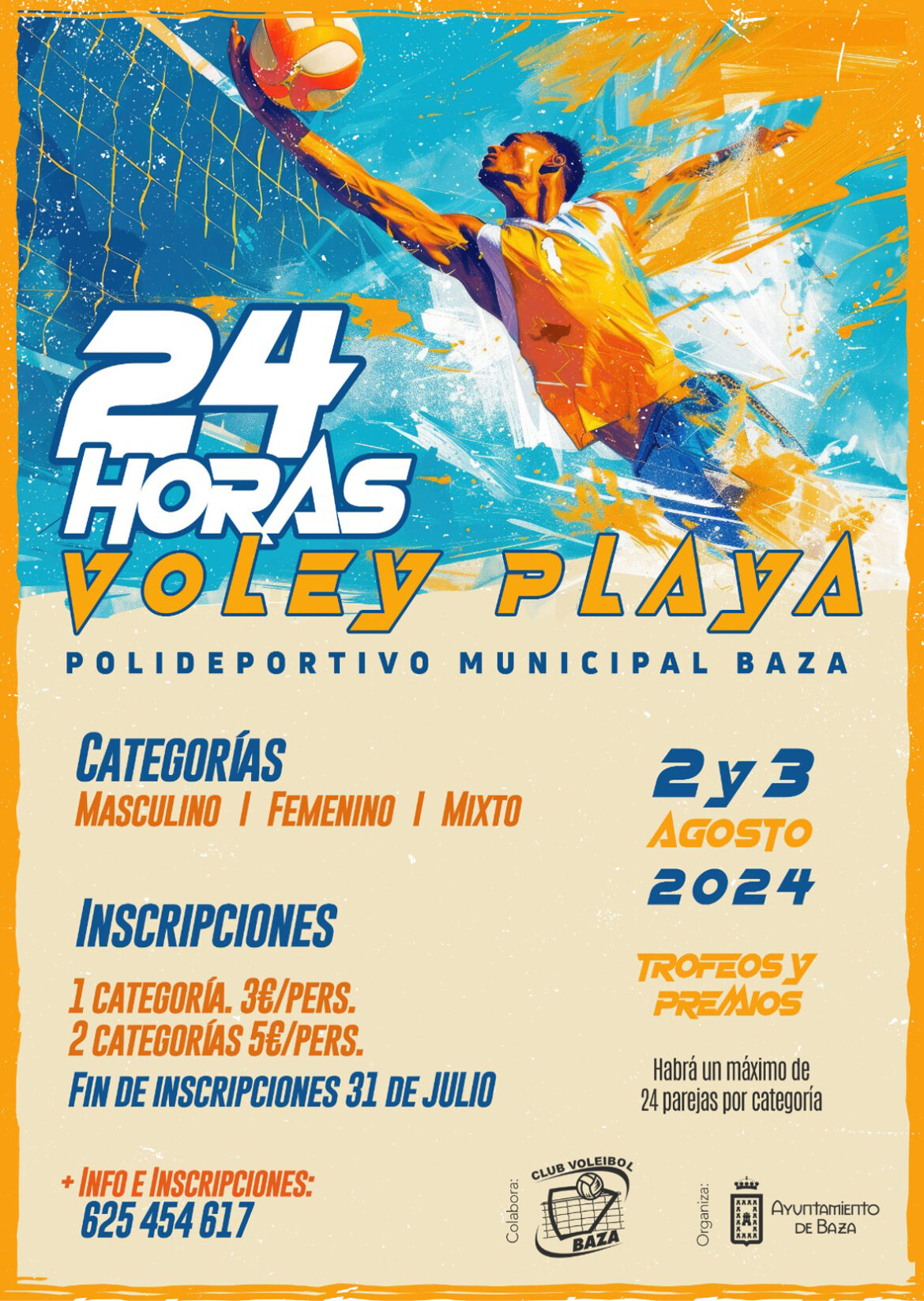 El primer escenario donde se celebraron fue el Parque de la Constitución. Pasaron después al pabellón de Ferias y Exposiciones y desde el año pasado se desarrollan en el Polideportivo Municipal. Nos referimos a las 24 Horas de Voley Playa, que vuelven un año más los días 2 y 3 de agosto, viernes y sábado, en su 28ª edicion. Para participar en ellas es necesario inscribirse llamando al 625 454 617 y el plazo termina el 31 de julio. Se establecen tres categorías: Masculino, Femenino y Mixto. Organiza Club Voleibol Baza y colabora el Ayuntamiento de Baza.