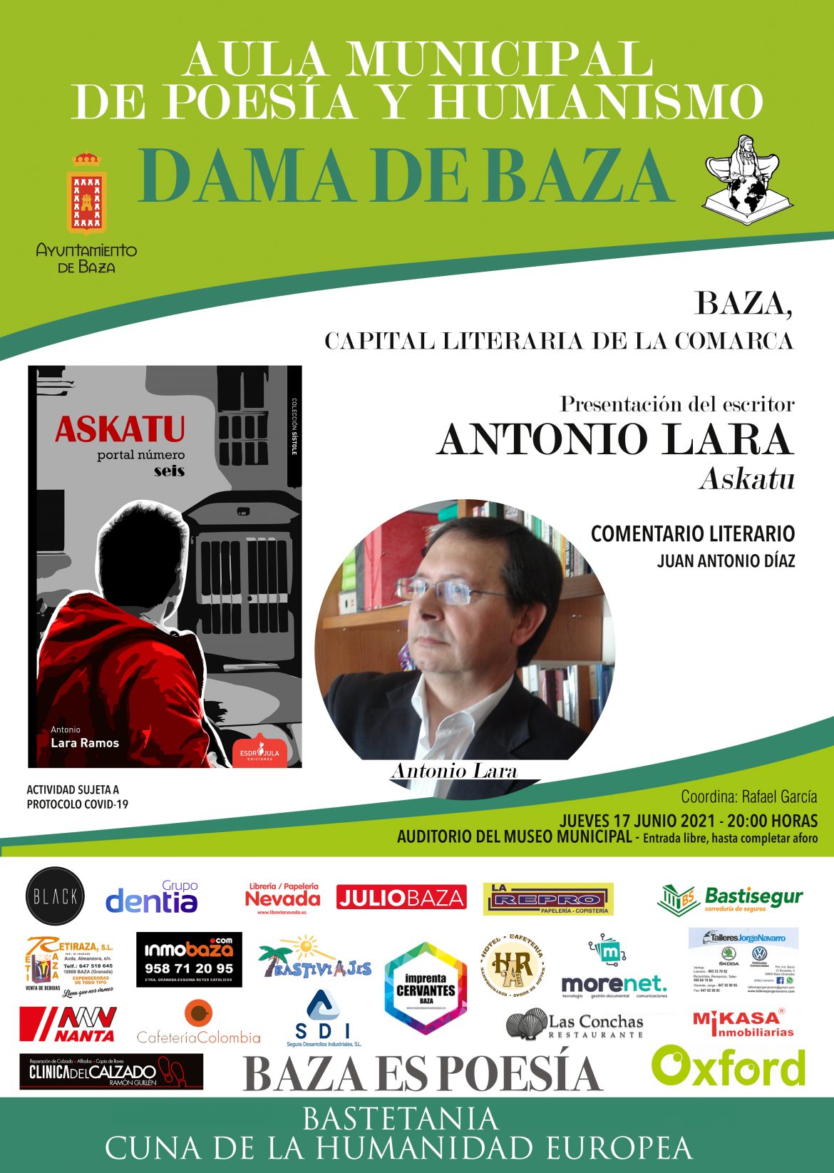 El Aula Municipal de Poesía y Humanismo ‘Dama de Baza’ contará este mes de junio como invitado con el escritor Antonio Lara, quien presentará su libro ‘Askatu’ acompañado del comentario literario de Juan Antonio Díaz. Esta actividad, que coordina Rafael García y que pone de relieve el papel de Baza como capital literaria de la comarca, se celebrará este jueves 17 de junio a las ocho de la tarde en el Auditorio del Museo Municipal con entrada libre hasta completar el aforo, teniendo en cuenta que es una actividad sujeta a protocolo Covid-19.