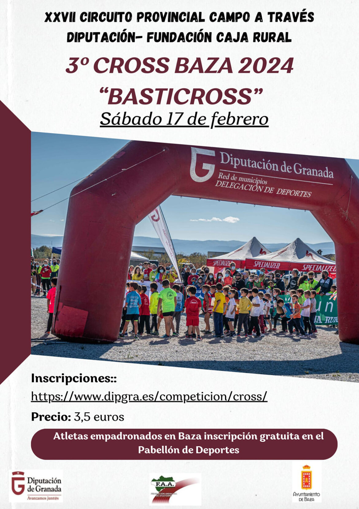 El miércoles 14 de febrero termina el plazo para inscribirse en la tercera edición del “Basticross”, que se celebrará el sábado 17 de febrero en el entorno de los yacimientos arqueológicos de nuestro término municipal. Estamos hablando de la carrera de campo a través que acoge la ciudad de Baza dentro del XXVII Circuito Provincial de Campo a través de la Diputación y que supondrá la sexta jornada de esta competición. Para apuntarse es necesario acudir a esta dirección electrónica www.dipgra.es/competición/cross/ y el coste será de 3,5 euros. No obstante, los corredores locales que estén empadronados en Baza no tendrán que pagar nada, será gratuita para ellos, aunque sí es necesario que formalicen su inscripción en el pabellón municipal de deportes antes del 14 de febrero.