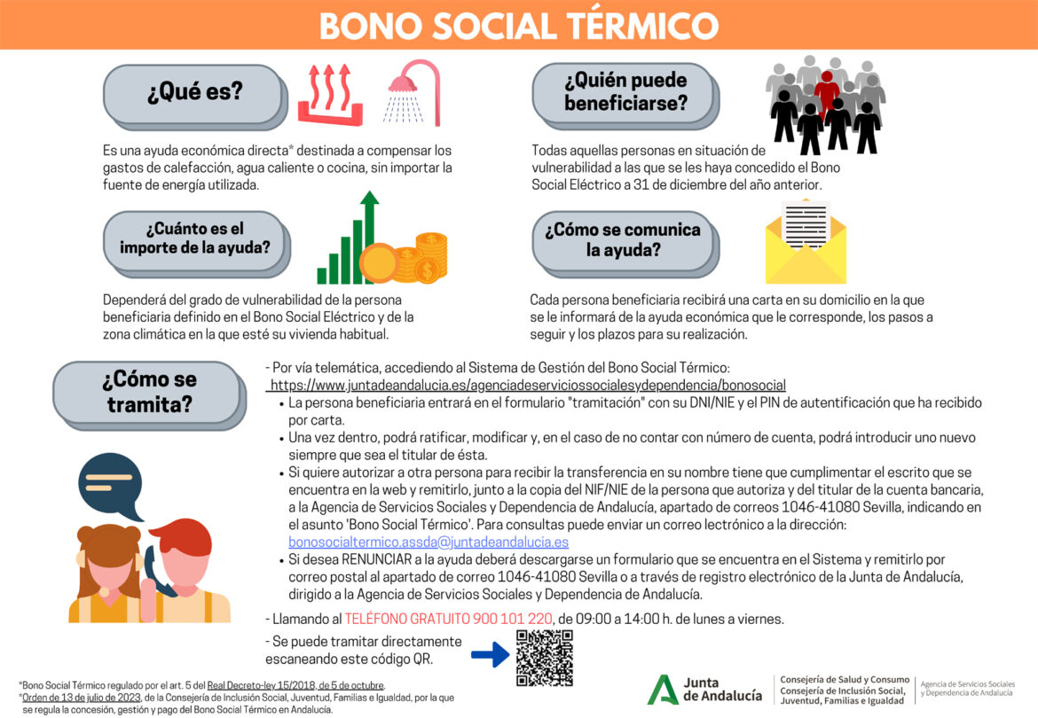 El Bono Social Térmico es una ayuda económica directa destinada a compensar los gastos de calefacción, agua caliente o cocina, sin importas la fuente de energía utilizada. Se concede a las personas que se encuentren en situación de vulnerabilidad y que tengan el Bono Social Eléctrico antes del 31 de diciembre de 2022. Para saber si le corresponde esta ayuda se debe recibir una carta de la Agencia de Servicios Sociales y Dependencia de Andalucía, indicándole que es beneficiario del Bono Social Térmico. A partir de ese momento, para recibir finalmente la ayuda, debe solicitarla a través de internet desde su teléfono móvil u ordenador en la dirección web: https://www.juntadeandalucia.es/agenciadeserviciossocialesydependencia/bonosocial y seguir las instrucciones que le indica. En caso de que le resulte complicado y necesite asesoramiento, diríjase al Centro Municipal de Bienestar Social del Ayuntamiento de Baza.