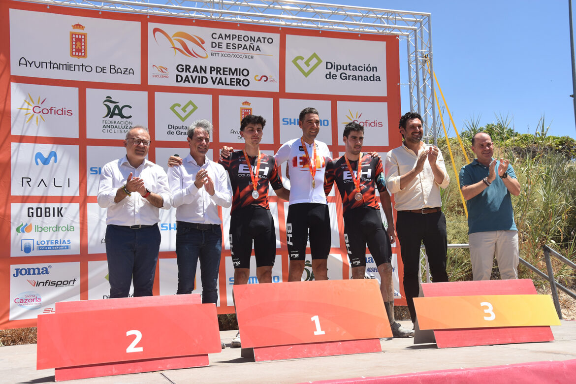 El circuito de bicicleta de montaña “David Valero” de Baza ha acogido, del 18 al 20 de julio, el Campeonato de España de BTT en las modalidades XCO, XCC y XCR. Remodelado en algunos de sus tramos para esta cita, este recinto ha sido el escenario ideal para la nueva gesta del deportista bastetano más importante de la historia, cuya trayectoria no deja de mejorar. Ante su gente, su familia, sus vecinos y sus paisanos, que no han dejado de animarlo y jalearlo durante toda la carrera, David Valero, del BH Coloma Team, se ha proclamado por décima vez Campeón de España de XCO en la categoría Élite, algo que nadie ha conseguido hasta el momento y que el ciclista olímpico de Baza ha acogido con la humildad y sencillez que lo caracteriza. La prueba, con la que se cerraba la programación de este campeonato, ha sido un paseo triunfal para Valero, que no ha dejado la primera posición en las siete vueltas al circuito que han tenido que sufrir los participantes. El alcalde de Baza, Pedro J. Ramos, ha sido el encargado de imponerle la medalla de oro en el podium, entre los aplausos y las emocionadas felicitaciones del público asistente. “Aunque era algo previsible, la victoria de David ha terminado siendo más que evidente, lo que no deja dudas de su posición en la BTT nacional. Estamos muy contentos por este nuevo éxito y le mandamos nuestra más sincera felicitación en nombre de toda la ciudad”, ha indicado Ramos tras la entrega de los premios.