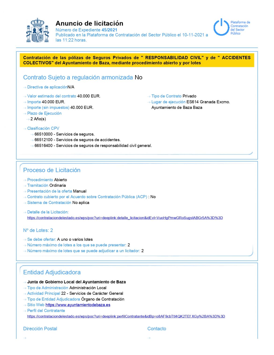 El Ayuntamiento de Baza informa que se han publicado en la Plataforma de Contratación del Sector Público los pliegos para la contratación por procedimiento abierto y por lotes del contrato de los seguros privados de responsabilidad civil y accidentes colectivos del Ayuntamiento. El Lote 1 es el correspondiente a responsabilidad civil y el Lote 2 el correspondiente a accidentes colectivos. Las ofertas se podrán presentar hasta las 15h del 18 de noviembre de 2021 en el Registro General de entrada de este Ayuntamiento. En el siguiente enlace se pueden consultar los pliegos que rigen esta contratación: