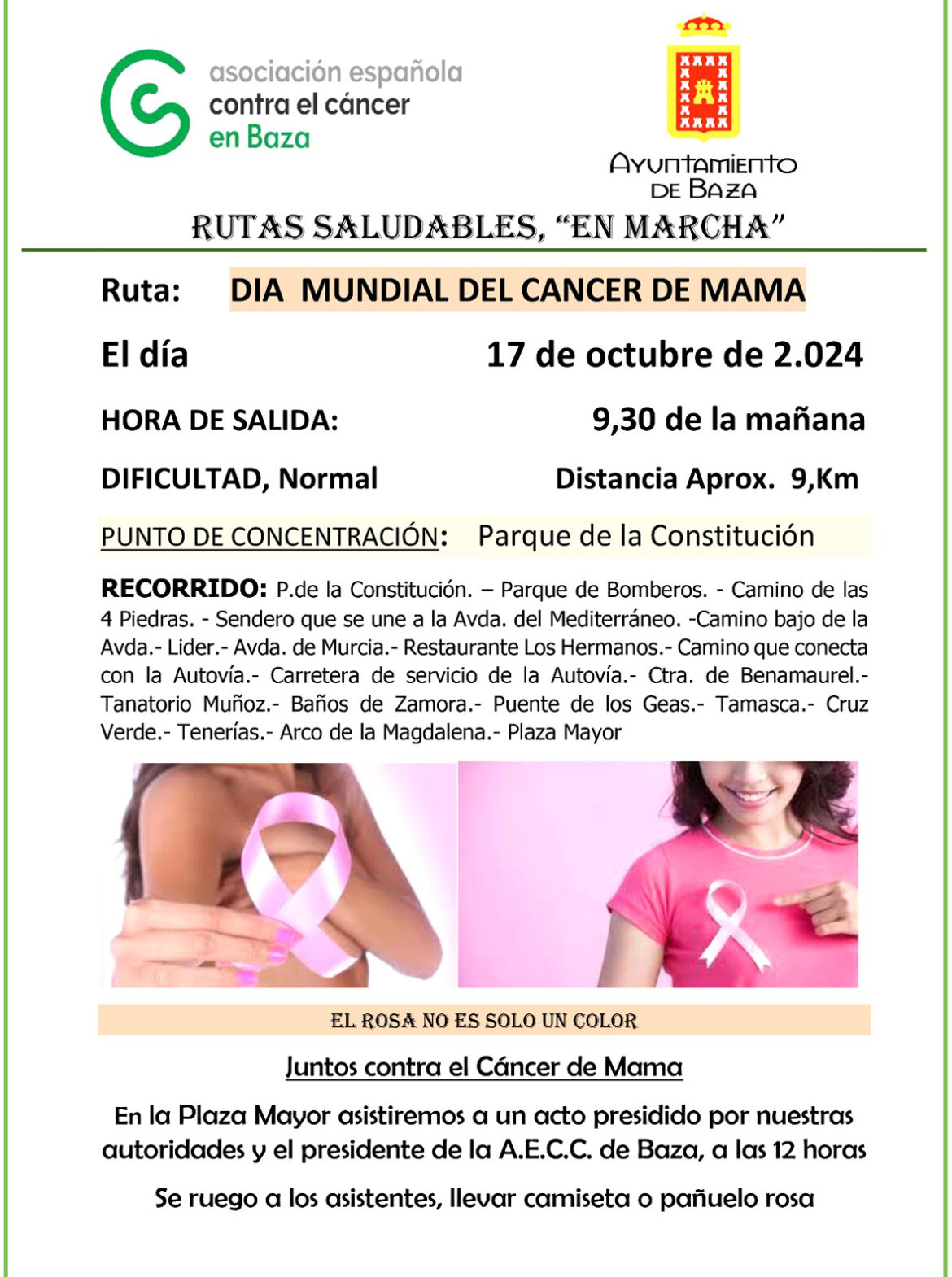 Será el jueves 17 de octubre. A las 9:30h. partirá desde el Parque de la Constitución una nueva Ruta Saludable “En Marcha”, que, a través de un recorrido extenso de casi nueve kilómetros, concluirá en la Plaza Mayor. Allí, a las 12:00h., se ha preparado el acto central de esta jornada. Además de algunas actividades en las que estarán presentes las autoridades municipales, se leerá el manifiesto donde se reflejan los mensajes que se quieren extender en esta edición. La idea es que sea una fiesta reivindicativa y de esperanza frente a la enfermedad y quieren contar con todos. Además, como modo de adherirse a esta jornada, el Ayuntamiento de Baza mantendrá durante toda esta semana la iluminación extraordinaria de color rosa sobre la fachada principal del edificio del Museo.
