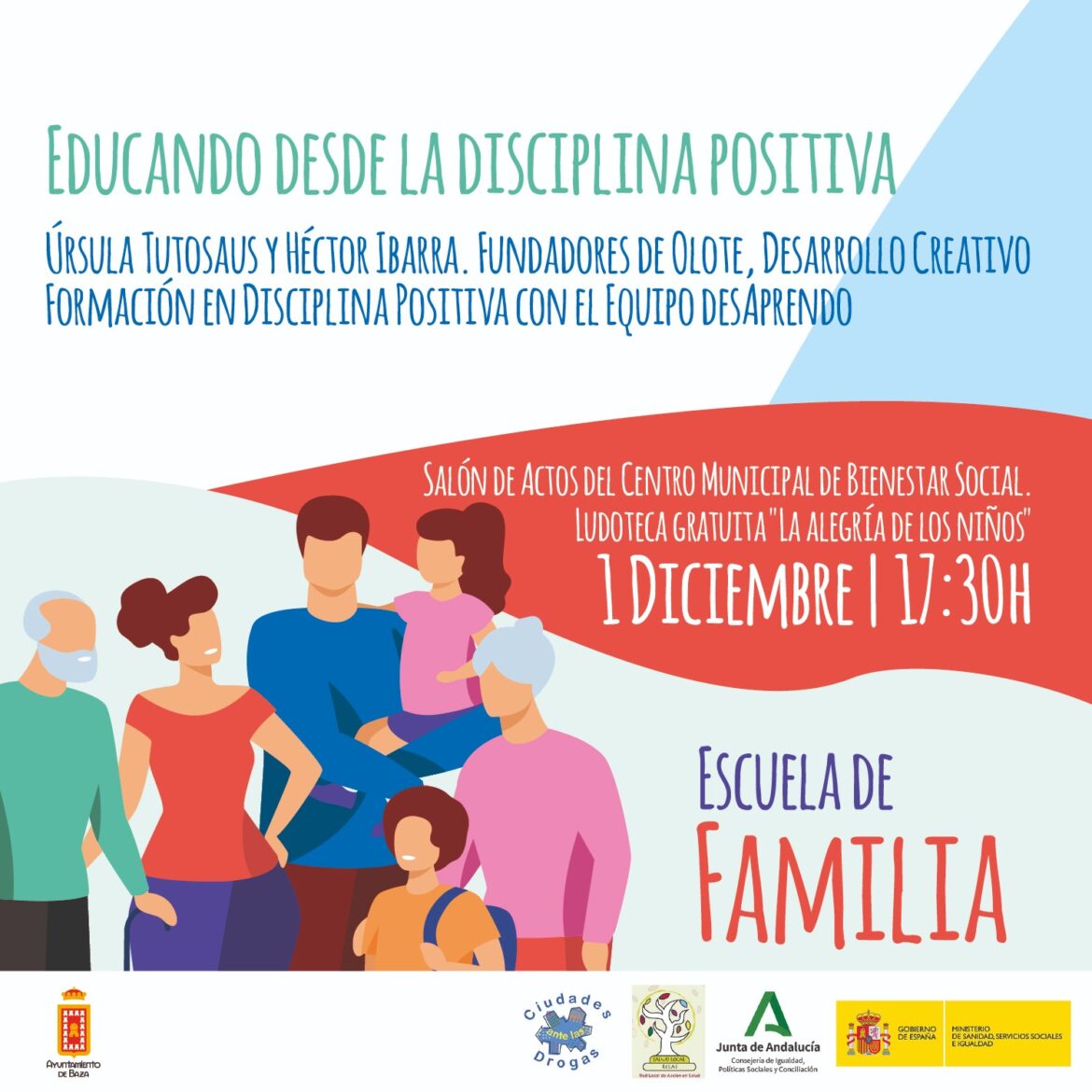 La Escuela Municipal de Familia que organiza el Ayuntamiento de Baza a través del área de Bienestar Social, Igualdad, Mujer, Salud, Deporte y Juventud continúa su actividad este jueves 1 de diciembre con una sesión en la que Úrsula Tutosaus y Héctor Ibarra, fundadores de “Olote, desarrollo creativo”, darán claves de formación en disciplina positiva con el equipo “Desaprendo”. Será en el Salón de Actos del Centro Municipal de Bienestar Social a partir de las cinco y media de la tarde. Para facilitar la asistencia, se habilita como siempre el servicio gratuito de ludoteca “La alegría de los niños”.