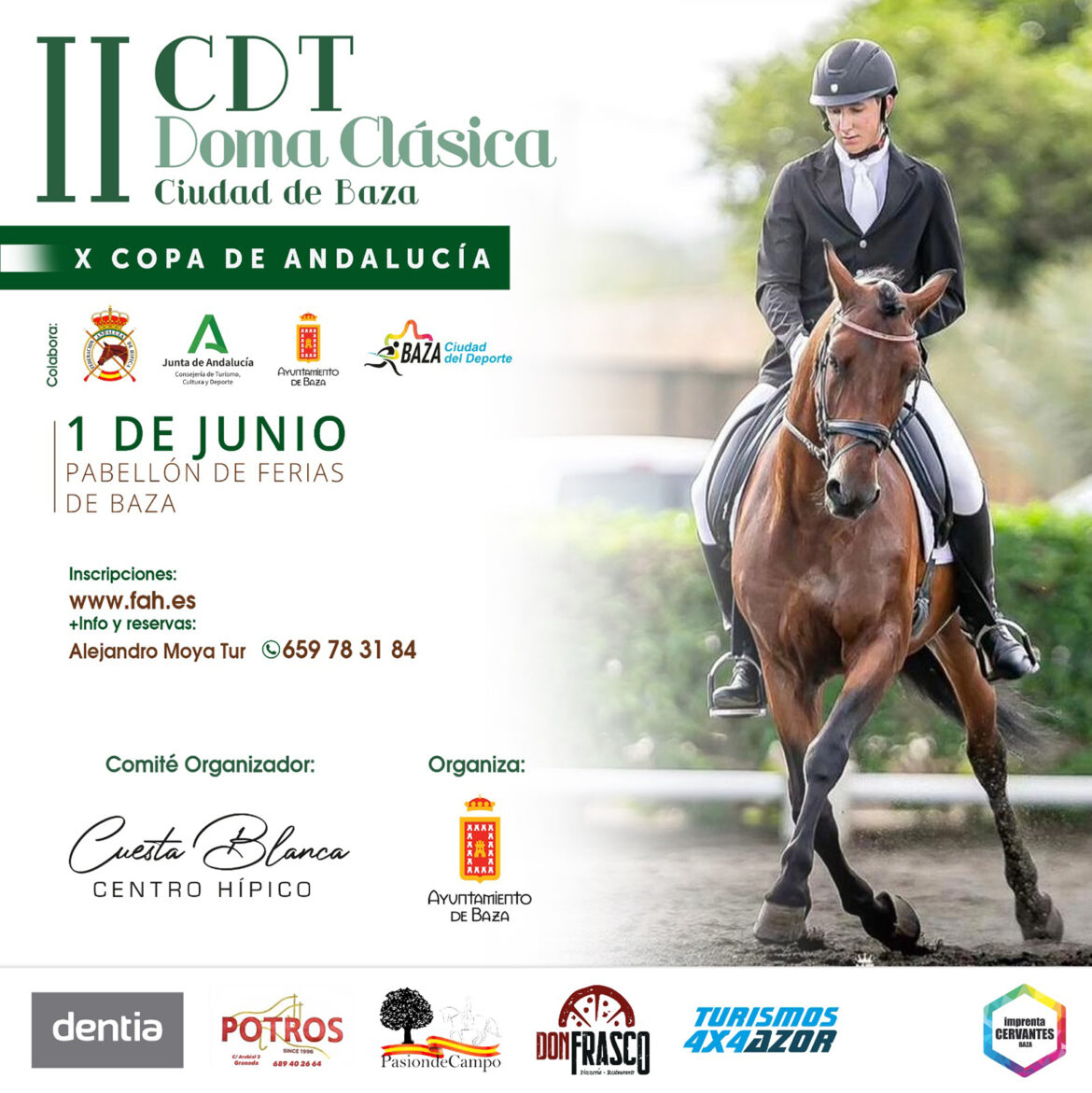 Las instalaciones del Pabellón Municipal de Ferias de la carretera de Benamaurel acogen este fin de semana, 1 y 2 de junio, a los mejores competidores de Doma Clásica de Andalucía. Se celebran, respectivamente, el II CDT Doma Clásica “Ciudad de Baza” X Copa de Andalucía y el CDT Doma Clásica X Copa de Andalucía. En ambos casos, la entrada es totalmente gratuita para disfrutar con esta disciplina ecuestre tan destacada. La organización de ambos eventos corre de la mano del Centro Hípico “Cuesta Blanca”, con la colaboración del Ayuntamiento de Baza.