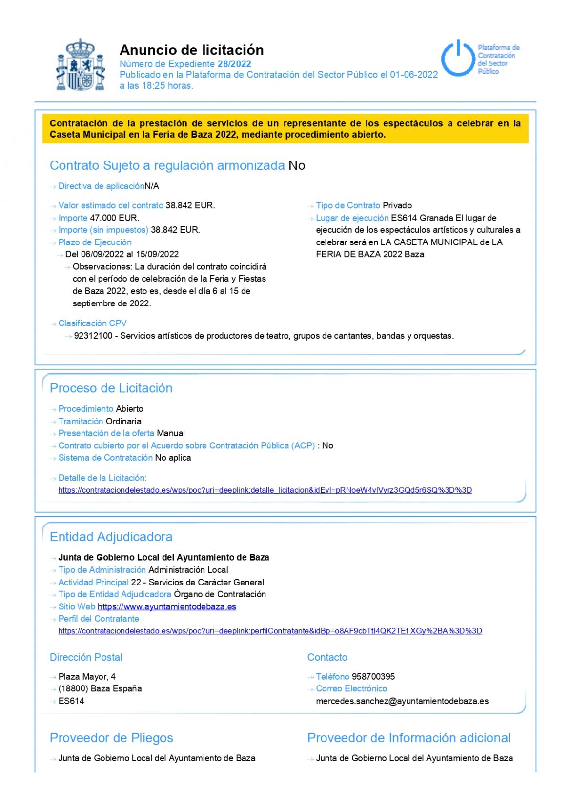 El Ayuntamiento de Baza informa que se han publicado en la Plataforma de Contratación del Sector Público los pliegos y condiciones que rigen el procedimiento de contratación de la prestación de servicios de un representante de los espectáculos a celebrar en la caseta municipal en la Feria de Baza 2022. Mediante procedimiento. Las ofertas se podrán presentar hasta las 14h del 16 de junio de 2022 en el Registro General de entrada de este Ayuntamiento. En el siguiente enlace se pueden descargar los pliegos y condiciones que rigen esta licitación: