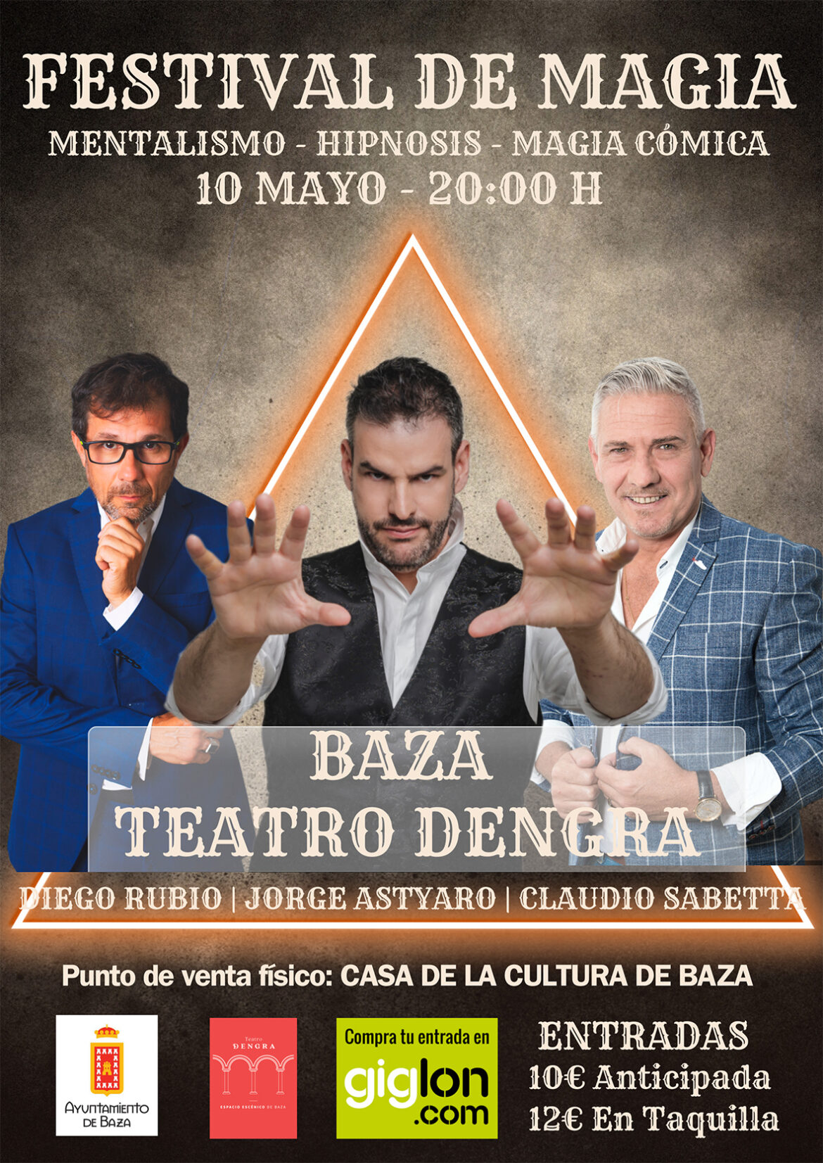 El teatro Dengra de nuestra ciudad abre sus puertas este viernes, 10 de mayo, a la magia. En concreto a un magnífico Festival de Magia en el que se mezclarán el mentalismo, la hipnosis y la magia cómica de la mano de profesionales tan reconocidos como Diego Rubio, Jorge Astyano y Claudio Sabetta. Será a partir de las 20:00 h. Las entradas se pueden adquirir ya en la Casa de la Cultura y en giglon.com desde 10 euros en anticipada y 12 en taquilla.