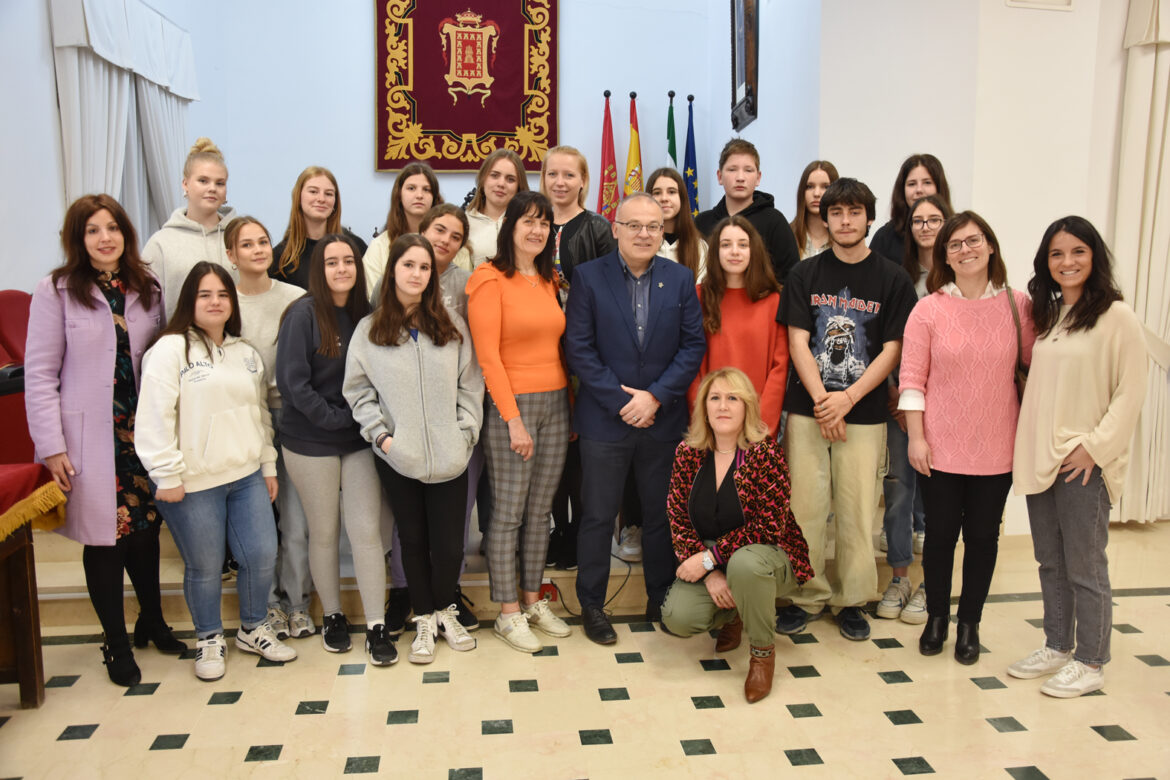 El alcalde de Baza, Pedro J. Ramos, acompañado por las concejalas de Educación, Priscila Martínez, y de Gobernación, Mª Carmen Sánchez, han recibido en el salón de plenos a un grupo de estudiantes de Eslovenia y de Finlandia que han participado con los alumnos del IES “Alcrebite” en una movilidad Erasmus, una inversión lingüística que, según la directora del centro bastetano, Mª Luisa González, ha dejado muy buenos resultados. En la imagen que acompaña aparecen los estudiantes eslovenos y finlandeses junto con sus profesores y con los alumnos bastetanos que han participado en esta experiencia.