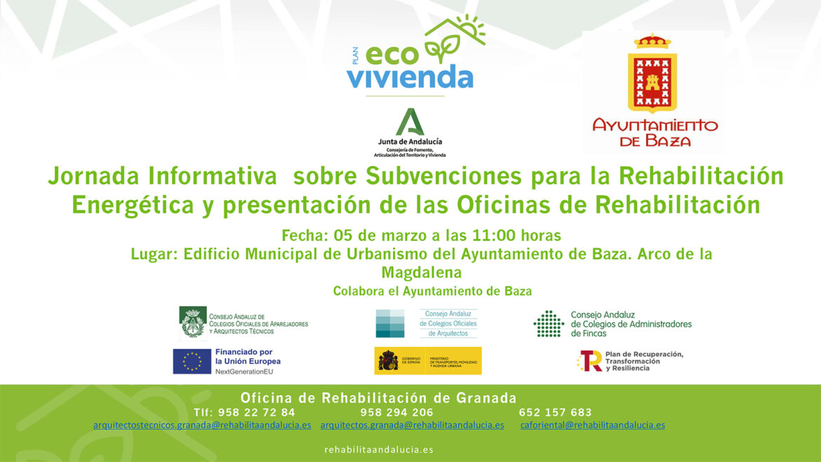 El martes 5 de marzo, a partir de las 11:00 horas, en la planta baja del edificio municipal de Urbanismo del Ayuntamiento de Baza, situado en el Arco de la Magdalena, se va a ofrecer una Jornada Informativa sobre las actuales Subvenciones para la Rehabilitación Energética de viviendas, acto que se aprovechará para presentar las Oficinas de Rehabilitación. La cita cuenta con la colaboración del Ayuntamiento y es totalmente gratuita y abierta a todo aquel que quiera presenciarla. De su organización se encarga el Colegio Oficial de Aparejadores y Arquitectos Técnicos de Granada. Será el momento adecuado para resolver dudas, plantear situaciones concretas, etc.