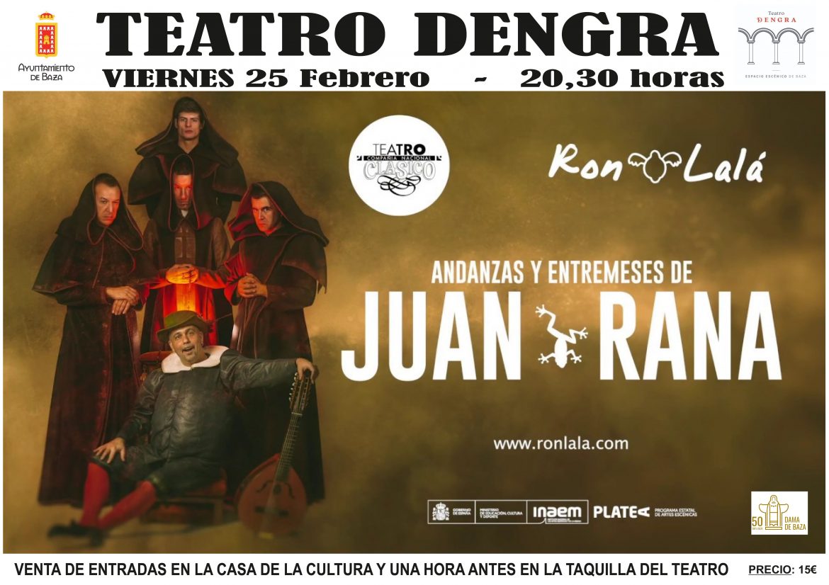 Todavía se pueden comprar de forma anticipada en la Casa de la Cultura las entradas anticipadas para “Andanzas y Entremeses de Juan Rana”, una producción de la Compañía Nacional de Teatro Clásico y de Ron Lalá que llega al Dengra este viernes 25 de febrero de la mano del Programa Estatal de Artes Escénicas Platea, al que se ha adherido el Ayuntamiento de Baza. Una ocasión única para disfrutar en Baza de este obra Finalista de los Premios Max 2021 Mejor Adaptación/ Versión (Álvaro Tato) y Mejor Vestuario (Tatiana de Sarabia).