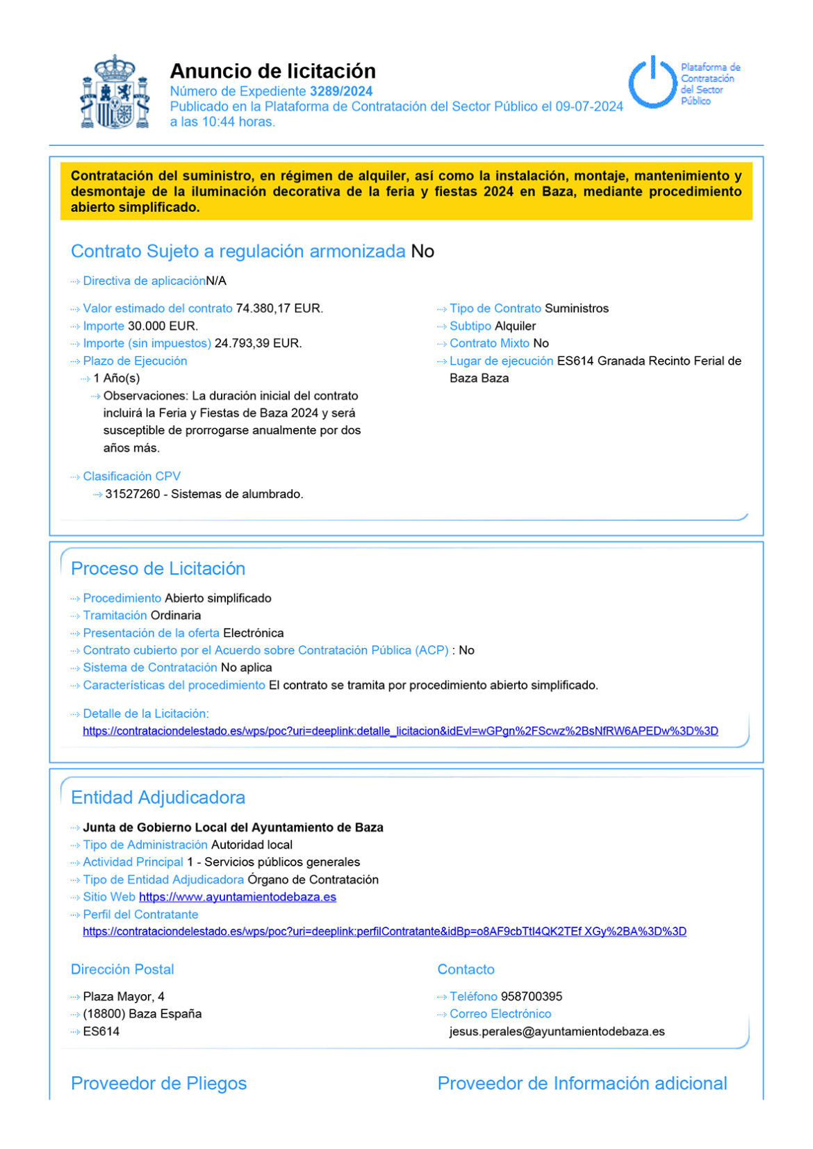La Plataforma de Contratación del Sector Público tiene publicado ya el anuncio que regula el proceso de licitación para la contratación del suministro, en régimen de alquiler, así como la instalación, montaje, mantenimiento y desmontaje de la iluminación decorativa de la Feria y Fiestas de septiembre 2024 en la ciudad de Baza, que se realiza mediante procedimiento abierto simplificado. El presupuesto base de licitación es de 30.000 euros, IVA incluido, para el año de ejecución del contrato, que puede ser prorrogado anualmente por dos periodos adicionales.