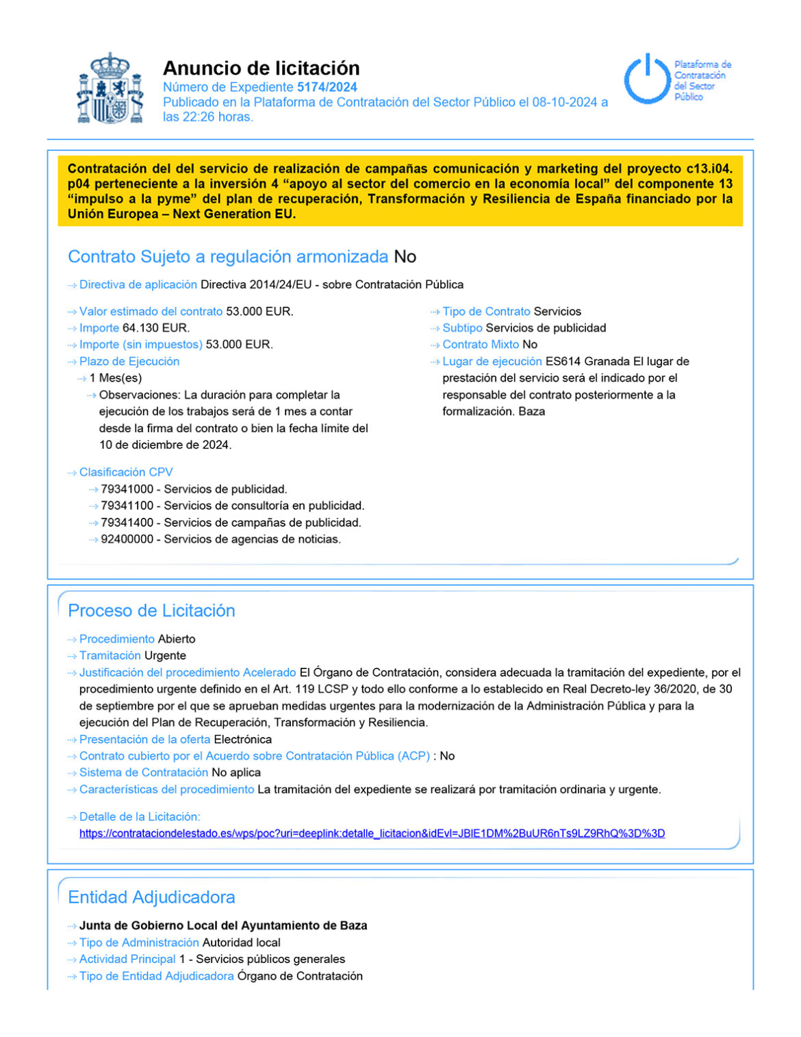 La Plataforma de Contratación del Sector Público tiene ya publicado el anuncio de licitación que rige la contratación del servicio de realización de campañas de comunicación y marketing del proyecto c13.i04. p04 perteneciente a la inversión 4 “apoyo al sector del comercio en la economía local” del componente 13 “impulso a la pyme” del Plan de recuperación, Transformación y Resiliencia de España financiado por la Unión Europea – Next Generation EU.