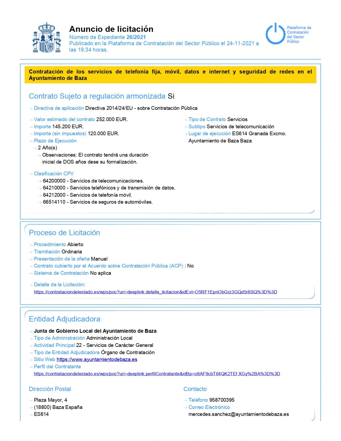 El Ayuntamiento de Baza informa que se ha publicado en la Plataforma de Contratación del Sector Público el pliego para la contratación por procedimiento abierto de los servicios de telefonía fija, móvil, datos e internet y seguridad de redes en el Ayuntamiento de Baza. Las ofertas se podrán presentar hasta las 14h del 27 de diciembre de 2021 en el Registro General de entrada de este Ayuntamiento. En el siguiente enlace se puede consultar el pliego que rige esta contratación