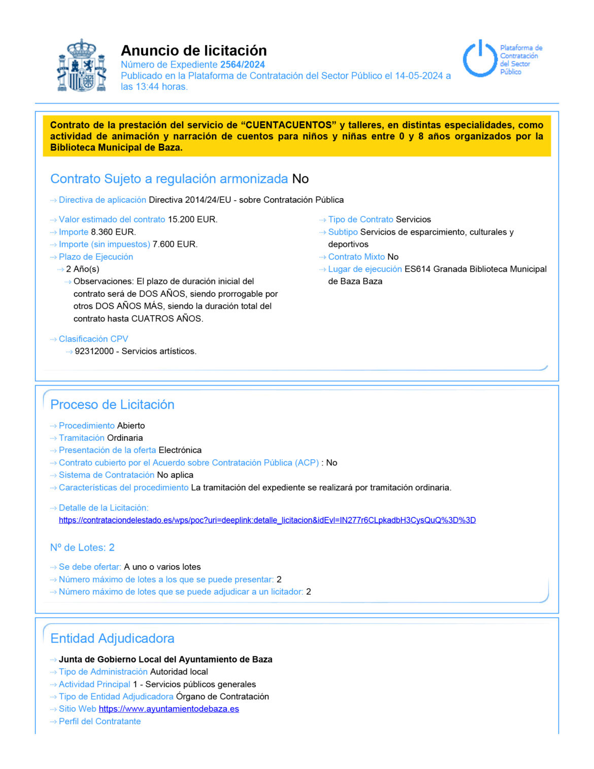 La Plataforma de Contratación del Sector Público tiene ya publicado el anuncio de licitación que rige la contratación de la prestación del servicio de “Cuentacuentos” y talleres, en distintas especialidades, como actividad de animación y narración de cuentos para niños de entre 0 y 8 años, organizados por la Biblioteca Municipal de Baza.