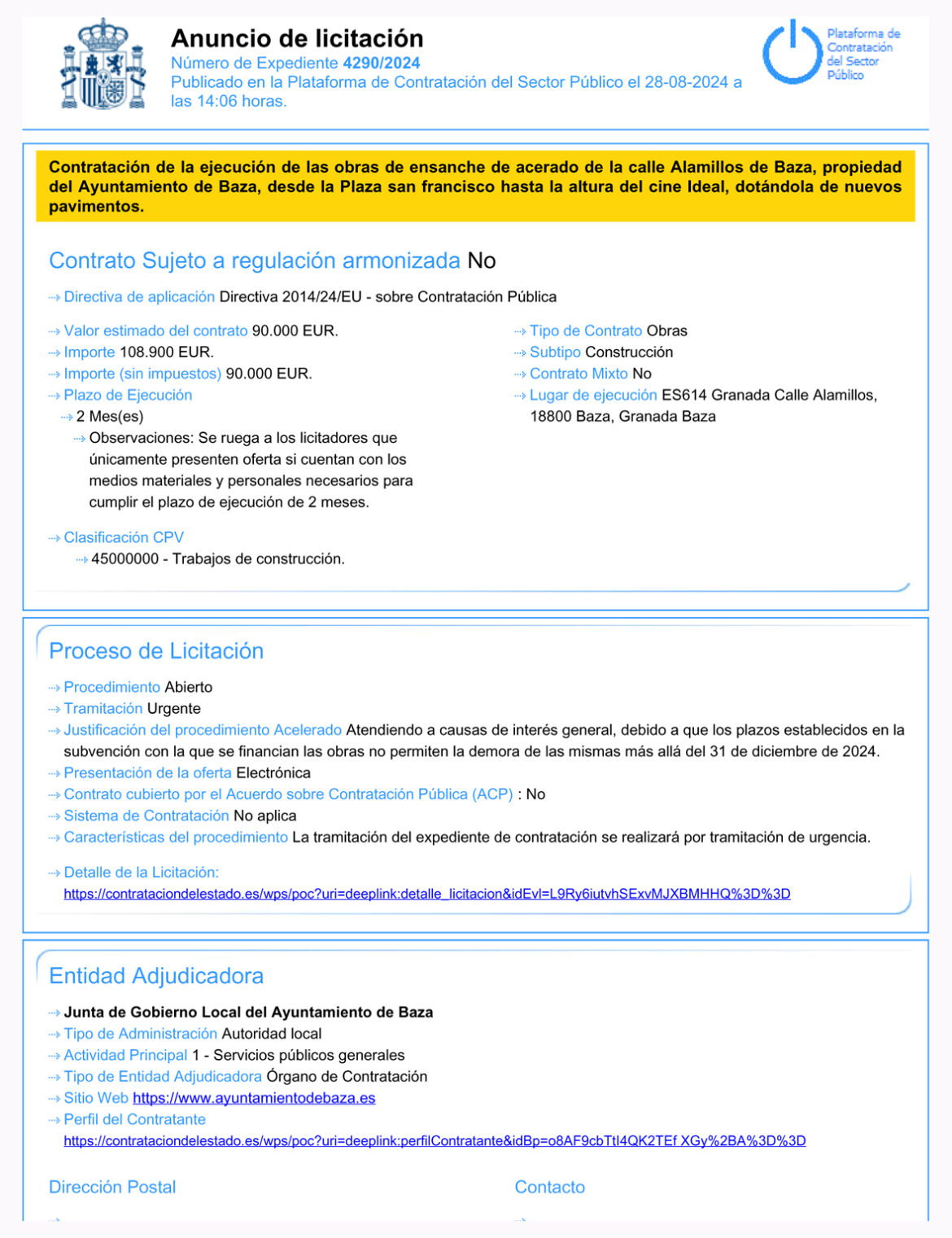 La Plataforma de Contratación del Sector Público tiene ya publicado el anuncio de licitación que rige la adjudicación de la ejecución de las obras de ensanche de acerado de la calle Alamillos, en concreto del tramo que transcurre entre la Plaza de San Francisco y el cine Ideal, dotándola de nuevos pavimentos. El presupuesto base de licitación es de 90.000 euros más IVA.