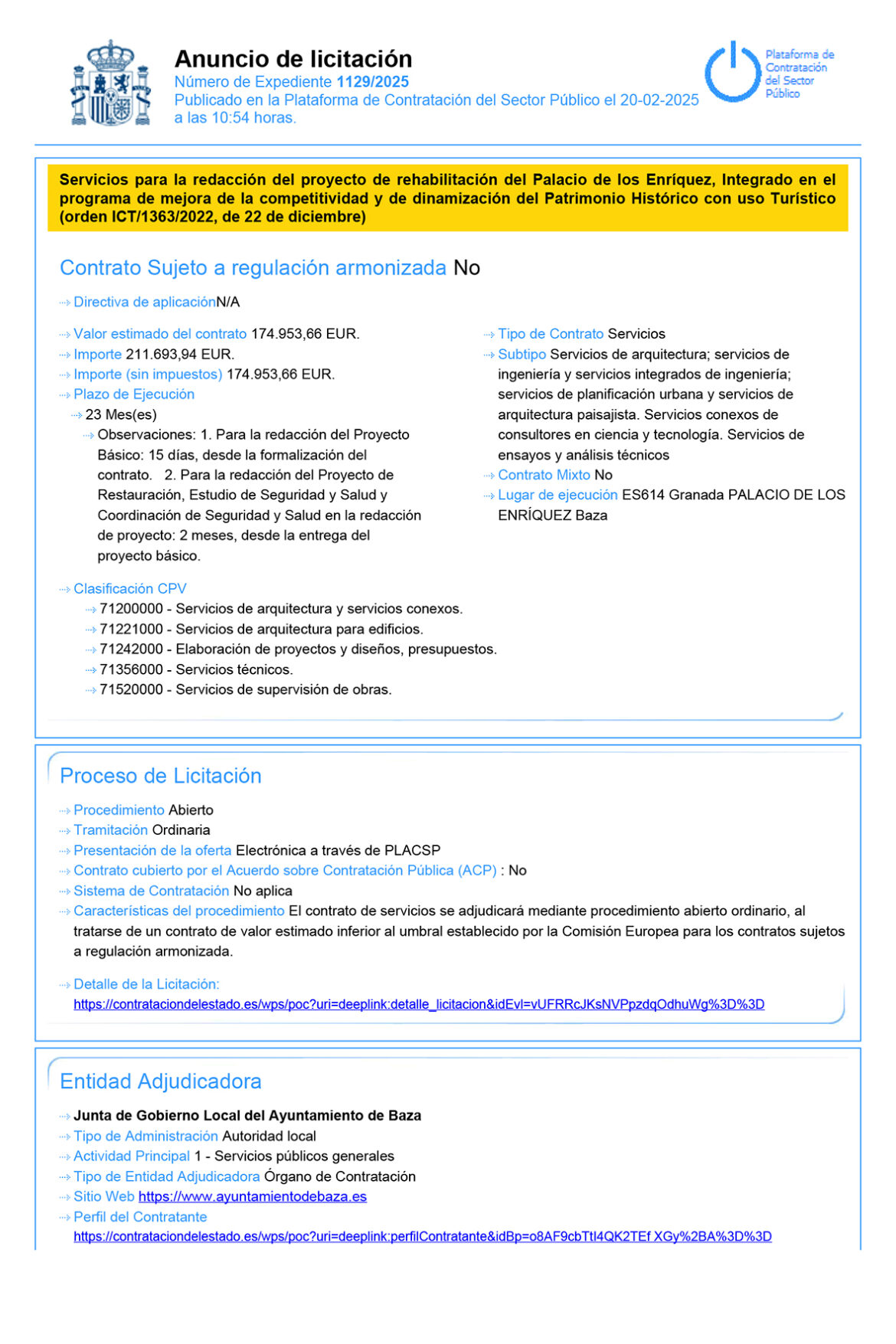 La Plataforma de Contratación del Sector Público tiene ya publicado el anuncio de licitación que rige el contrato de servicios para la redacción del proyecto de rehabilitación del Palacio de los Enríquez, integrado en el Programa de Mejora de la Competitividad y de Dinamización del Patrimonio Histórico con Uso Turístico (orden ICT/1363/2022, de 22 de diciembre). El presupuesto base de licitación es de 211.693,94 euros, IVA incluido.