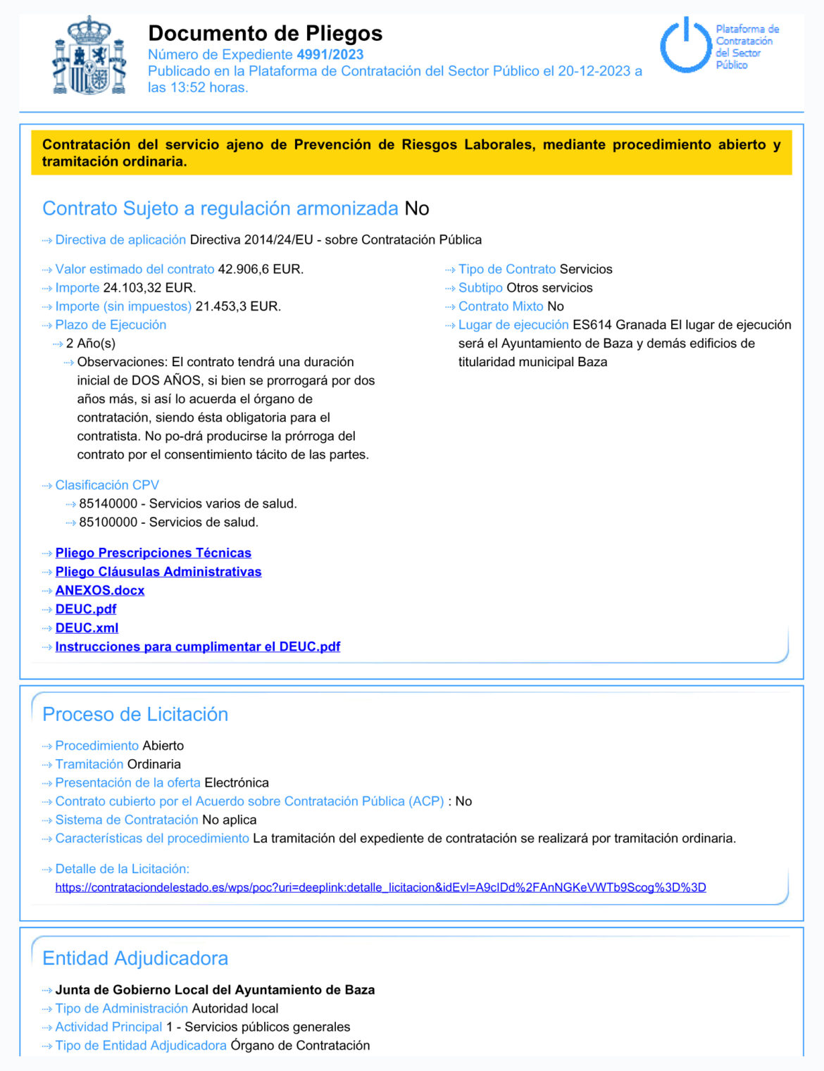 Ya se encuentra publicado en la plataforma de contratación del sector público el anuncio y los documentos correspondientes que van a regir la contratación del servicio ajeno de Prevención de Riesgos Laborales del Ayuntamiento de Baza mediante procedimiento abierto y tramitación ordinaria. El presupuesto base de licitación es de 24.103,32 euros, iva incluido, para los dos años de duración del contrato. Las ofertas podrán presentarse hasta el día 4 de enero de 2024.