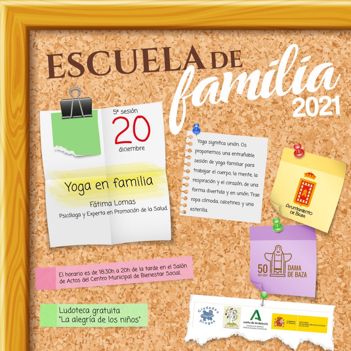 La Escuela Municipal de Familia que organiza el Ayuntamiento de Baza a través del área de Bienestar Social, Igualdad, Mujer, Salud, Deporte y Juventud cierra su edición de otoño el próximo lunes 20 de diciembre con una sesión de “Yoga en familia” que impartirá Fátima Lomas, psicóloga y experta en promoción de la salud.