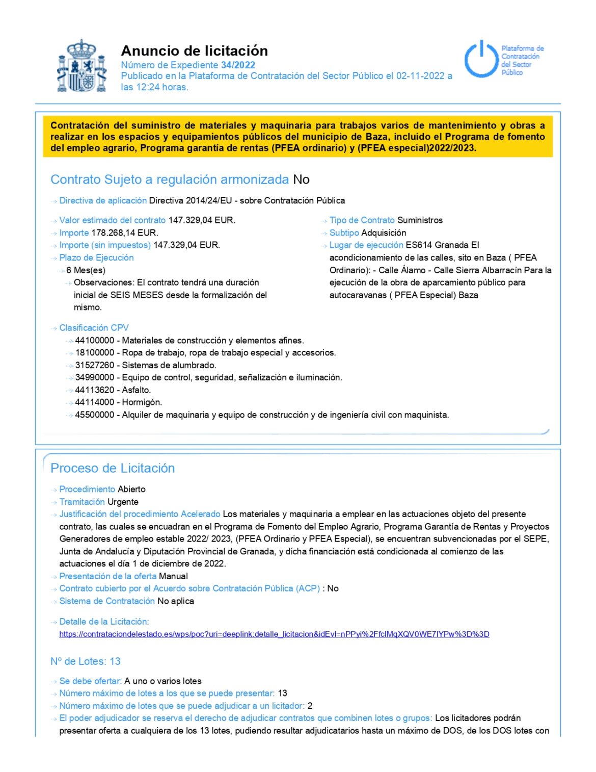 El Ayuntamiento de Baza informa que se han publicado en la Plataforma de Contratación del Sector Público los pliegos y condiciones para la contratación del suministro de materiales y maquinaria para trabajos varios de mantenimiento y obras a realizar en los espacios y equipamientos públicos del municipio de Baza, incluido en el Programa de Fomento del Empleo Agrario, Programa Garantía de Rentas y proyectos generadores de empleo estable (PFEA ordinario y PFEA especial). Mediante procedimiento abierto y por lotes. Las ofertas se podrán presentar hasta el 17 de noviembre de 2022 en el Registro General de entrada de este Ayuntamiento. En el siguiente enlace se pueden descargar los pliegos y condiciones que rigen esta licitación: